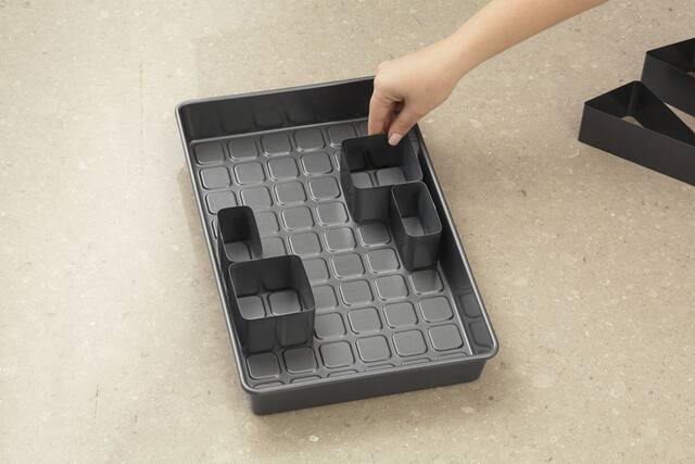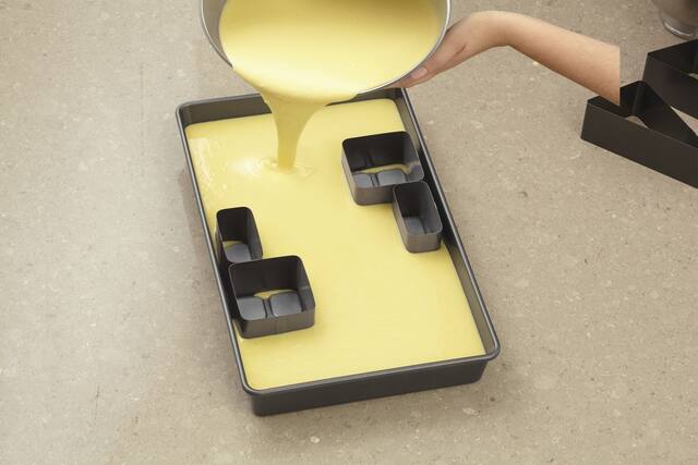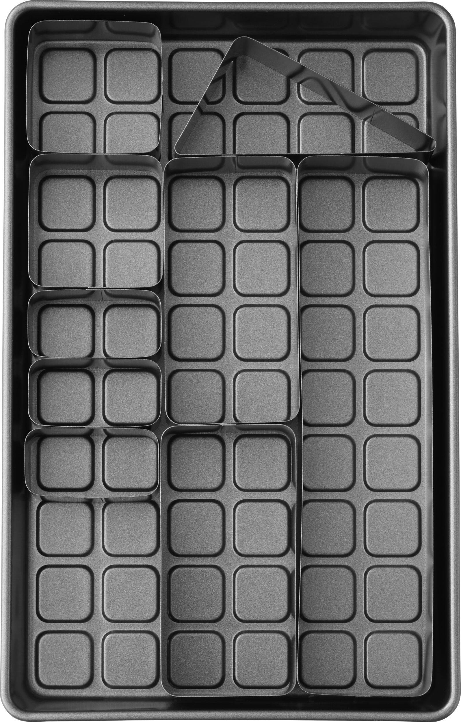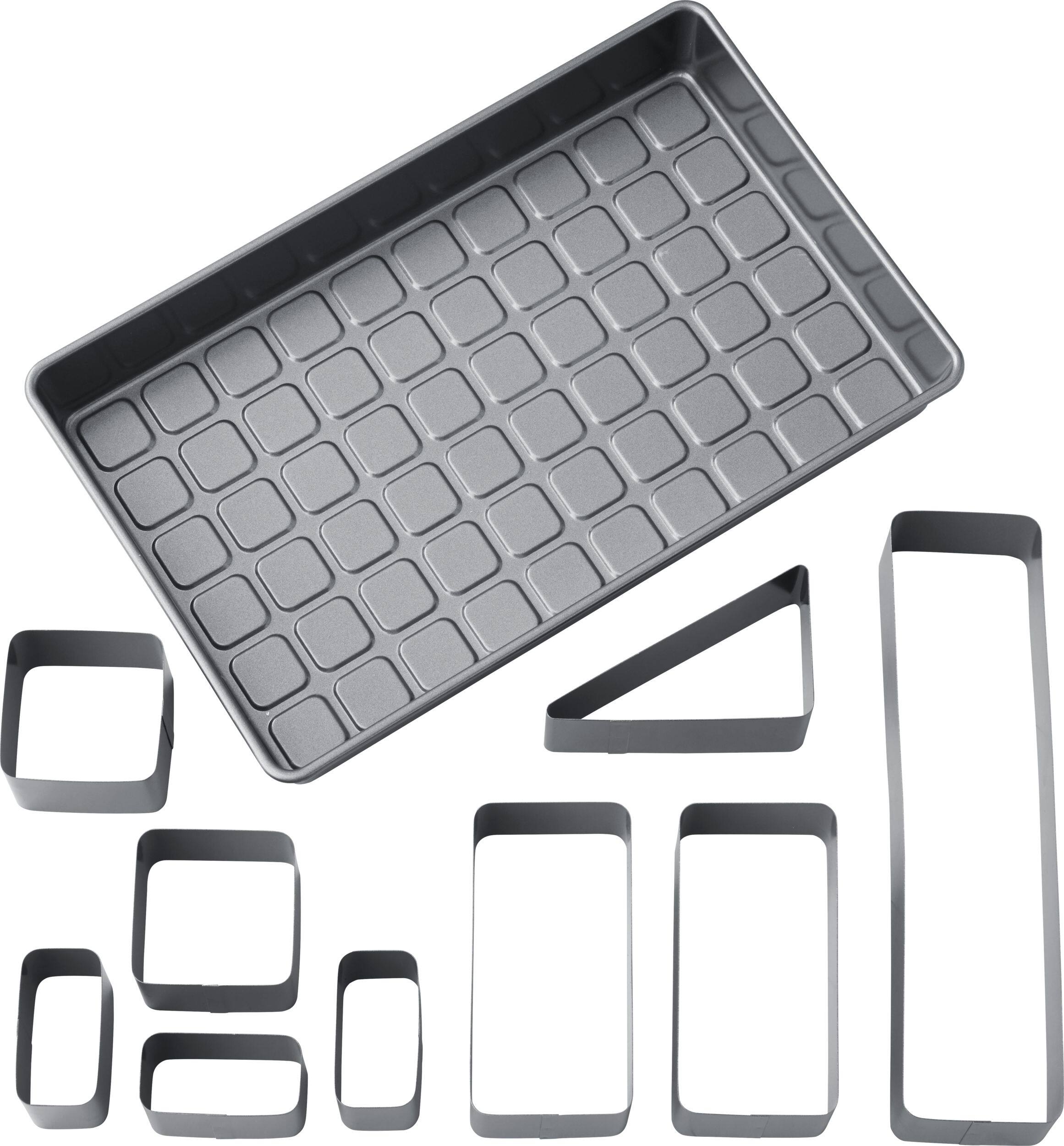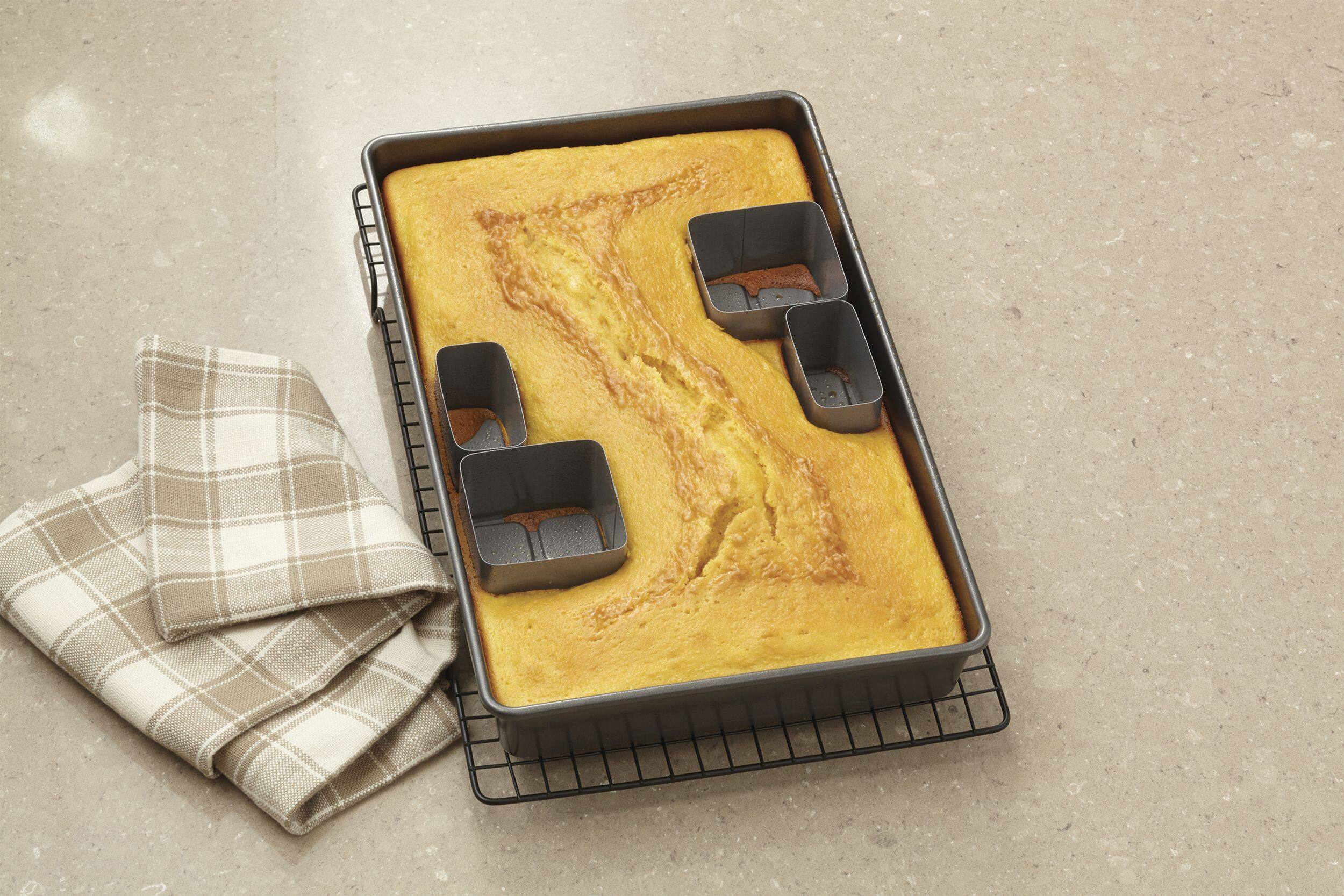 Rectangular pan features a grid bottom that holds inserts securely and prevents batter from seeping through