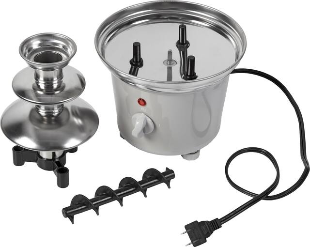 • Uses up to one pound of chocolate and keeps it flowing so everyone can dip fruit, marshmallows, pretzels, and even bacon slices in this chocolate fountain