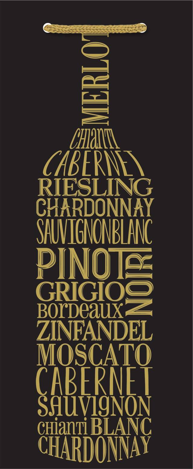 You may be interested in these similar products shown below.Wine Bottle Bag features various names of wines in gold letters formed to create the shape of a wine bottle