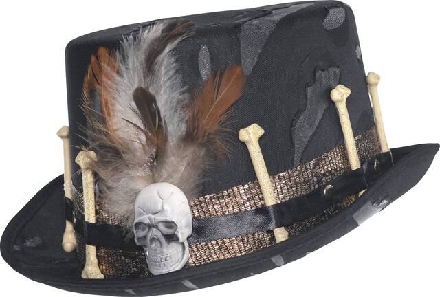 This voodoo hat is adorned with bones, real feathers, and a skull face in the centre