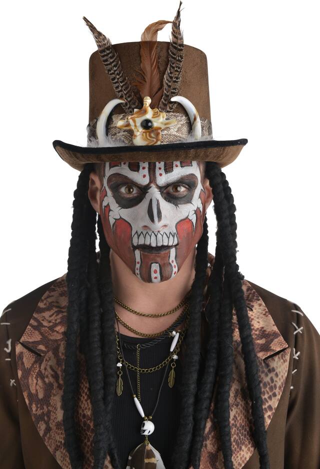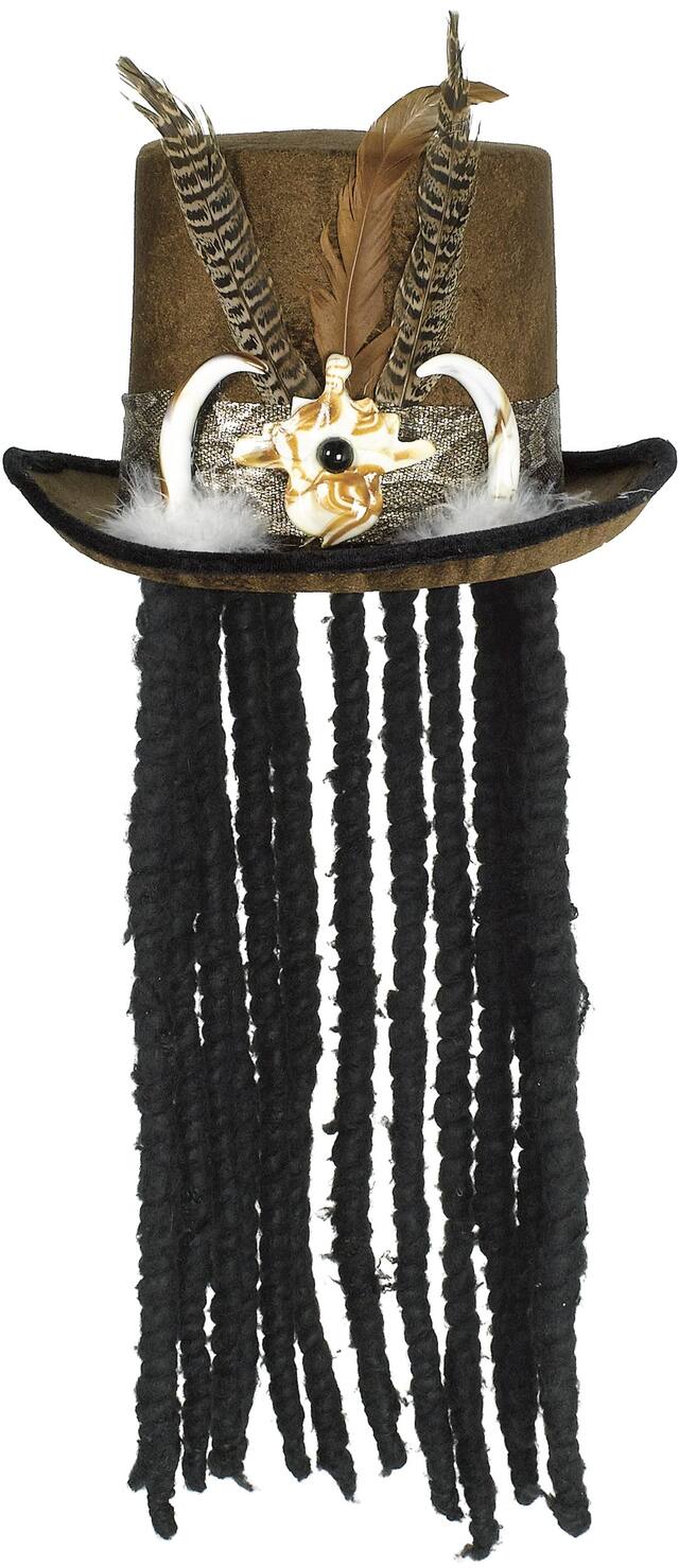 Features a brown velour top hat with attached faux dreadlocks, feathers, claws, and a metallic snakeskin hat band