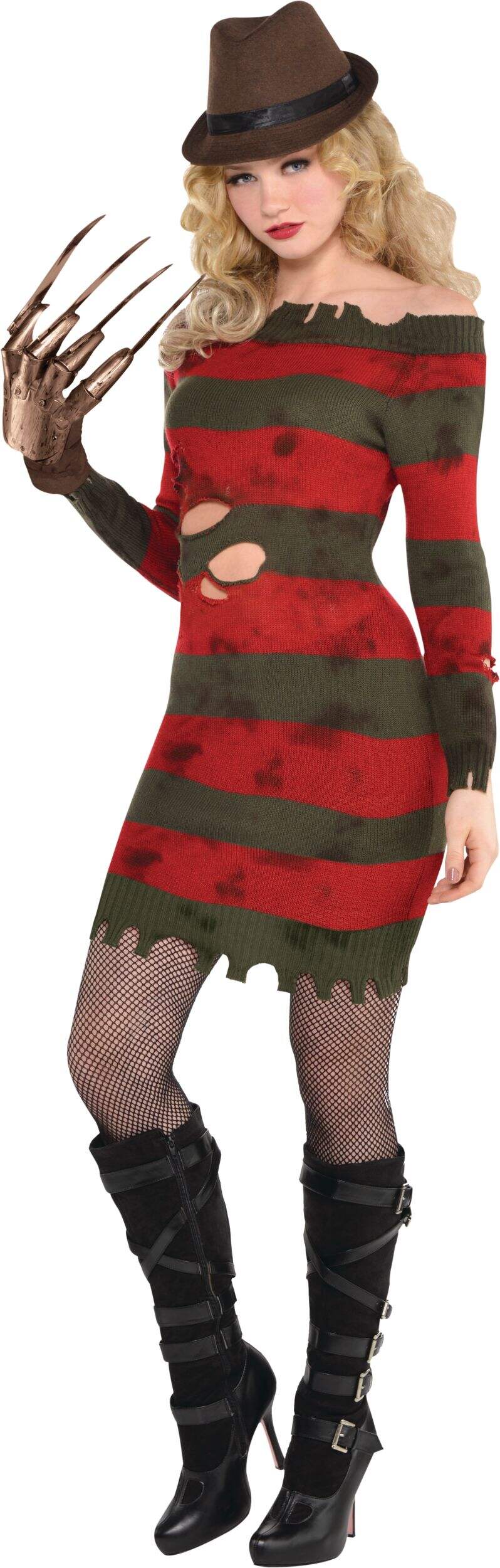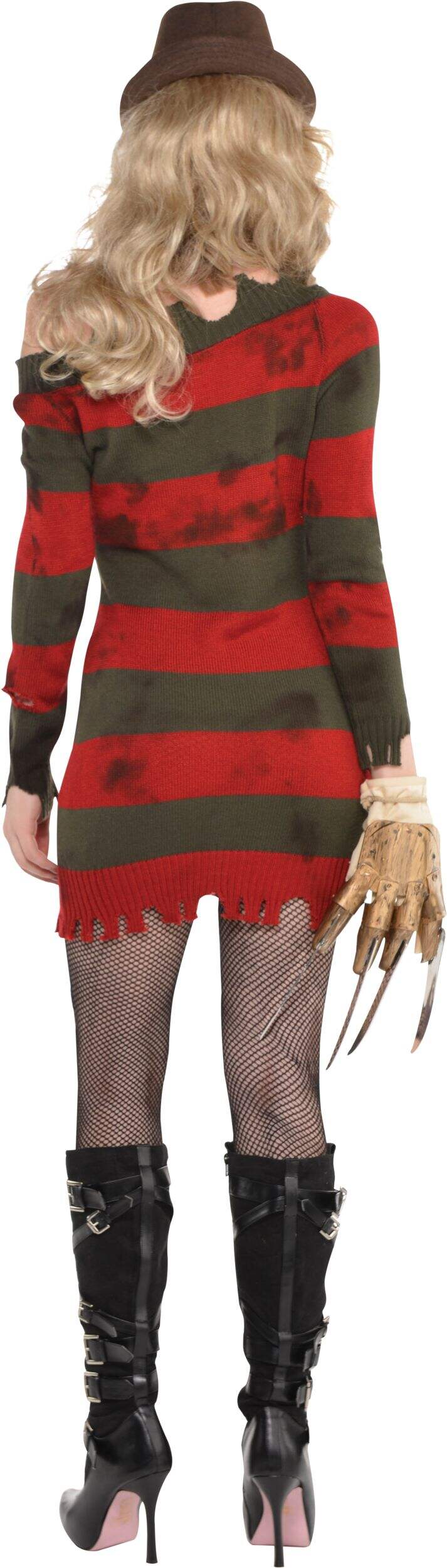 Haunt their dreams in this sexy Miss Krueger costume. The ripped and blood-splattered knit sweater dress features red and brown horizontal stripes. Slip on the matching fedora and slasher glove to complete this Freddy Krueger costume for women. Shoes and tights not included.