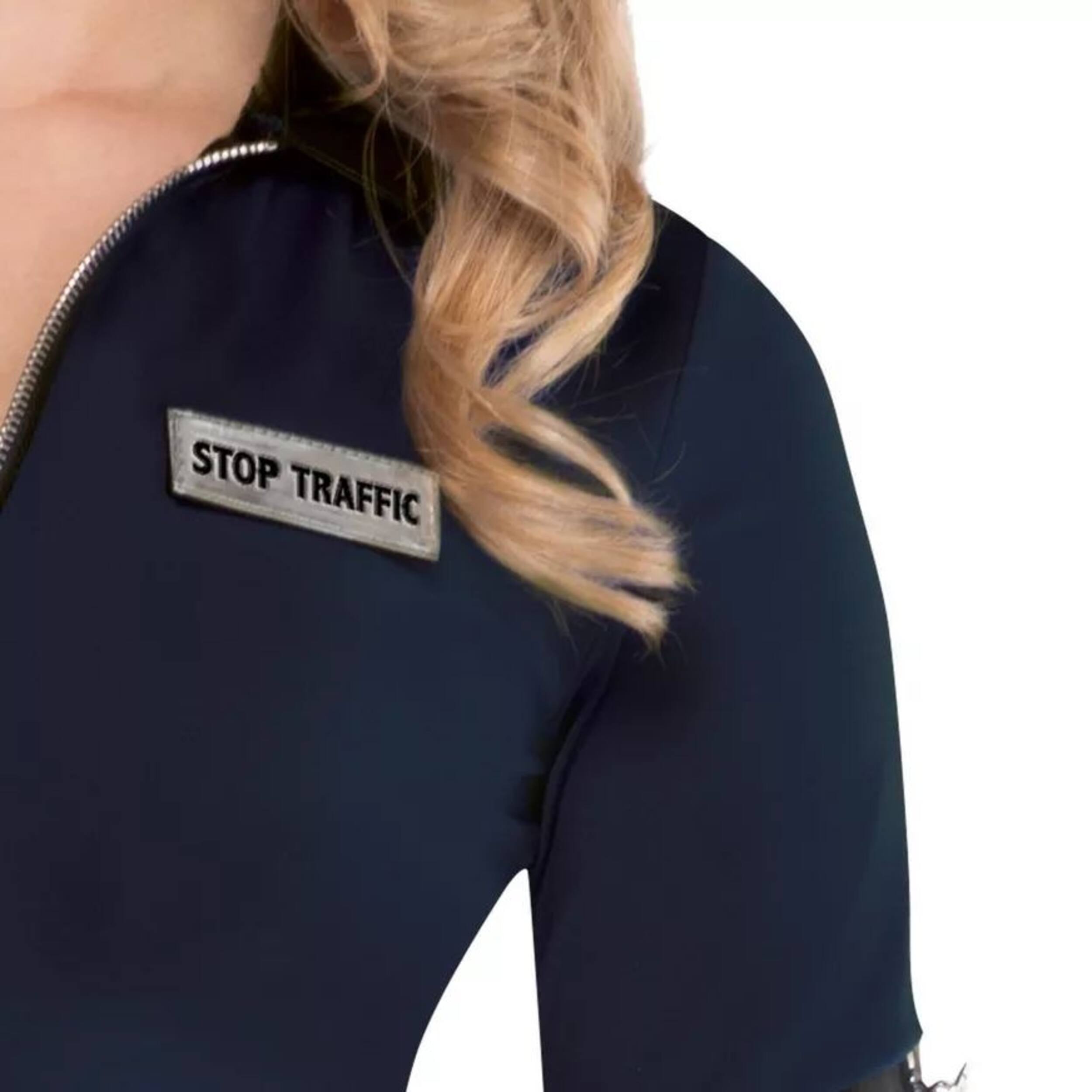 Cop Costume features a flattering, form-fitting navy blue catsuit with a crisp collar, cuffed sleeves, and a center-front zipper with a silver badge pull tab