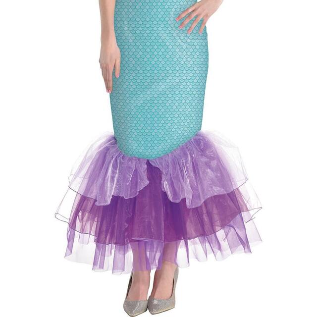 • The Little Mermaid Women's Ariel Costume features a light blue dress with purple mesh trim and purple mesh designed to look like Ariel's signature seashell bra