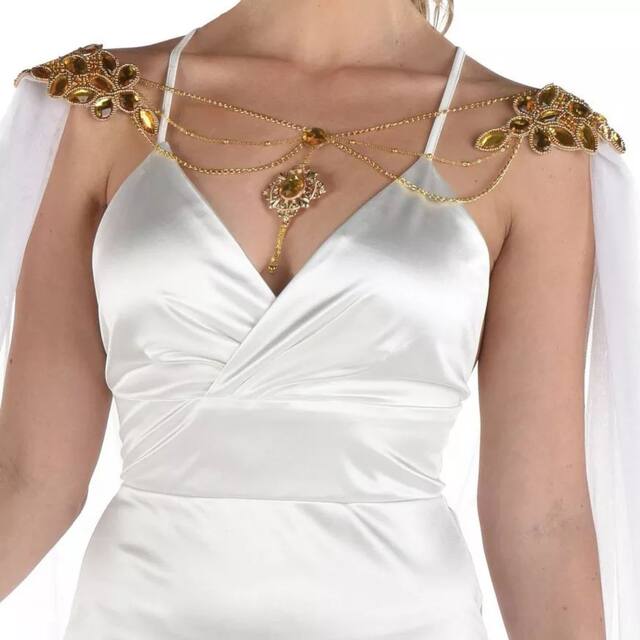 Channel your inner Roman empress with the Amscan Ethereal Cape. This ethereal white tulle cape features applique shoulder coverings and resplendent gold chains. Additionally, white gemstones drape along the chest and back. A dangling gold brooch lies in the middle of the chest. Made of high-quality polyester, the cape is long-lasting for repeated use during theme parties. Besides, it is easy to care for. Simply wipe clean with a damp cloth. The sheer tulle cape is 48 inches long and a single size fits most teens and adults.