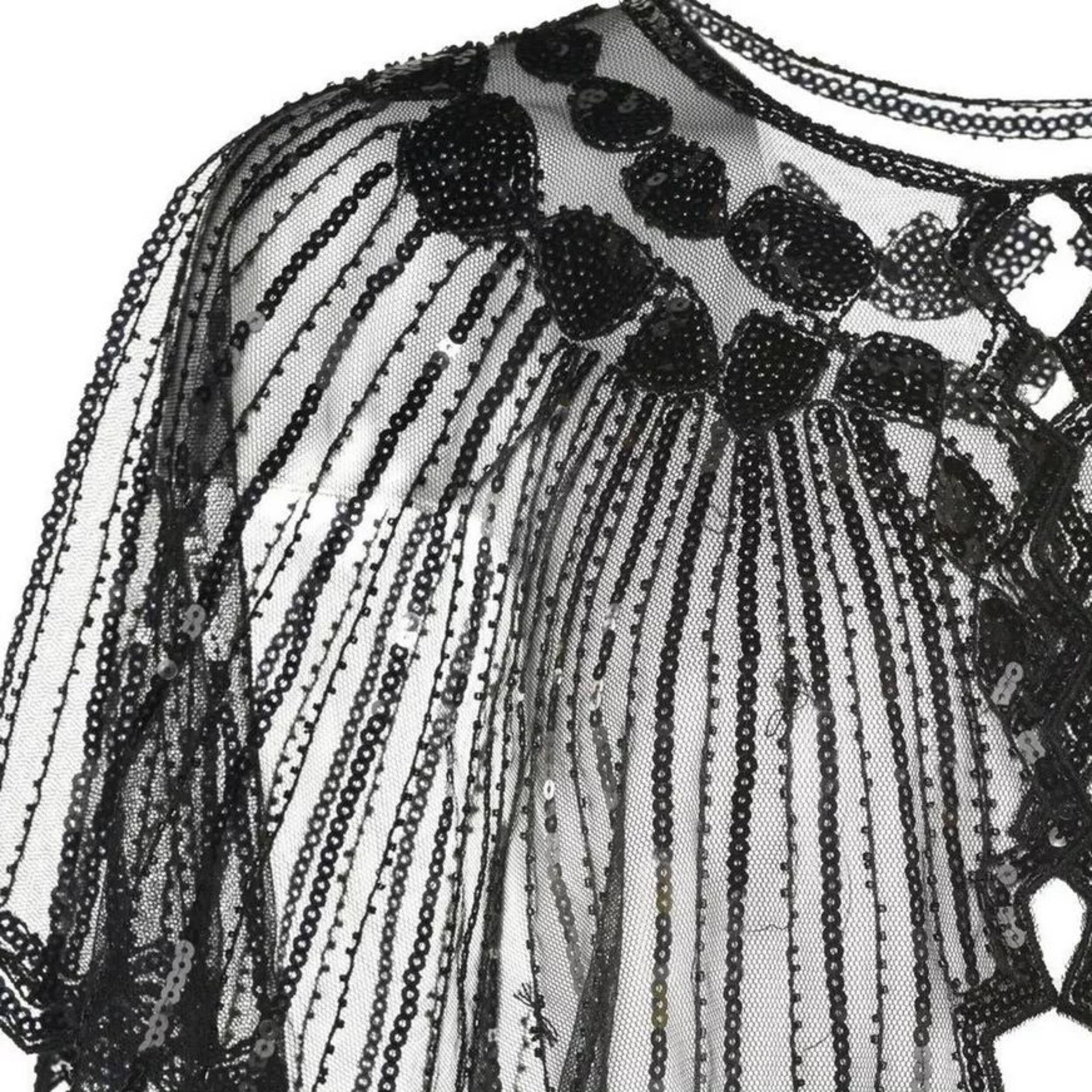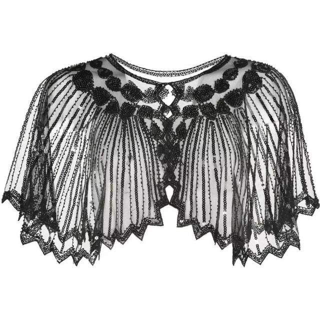 Top off your roaring 20s ensemble with the Fancy Sheer Capelet. This stunning capelet features a solid black colour and instantly elevates your look. It's made of sheer mesh and has an art deco-inspired design made of black sequins and beading. Made of high-quality polyester, the Halloween prop is great for special occasions, parties, and more. One size fits up to 37 inches (chest size). For lasting use, spot-clean only and line dry.