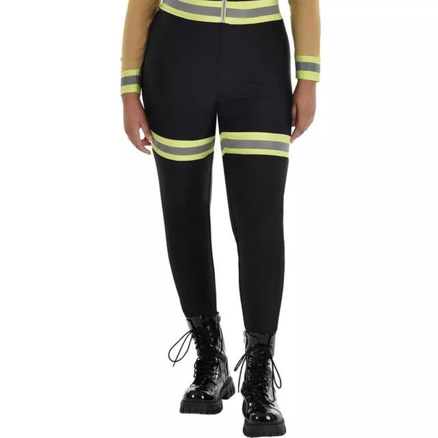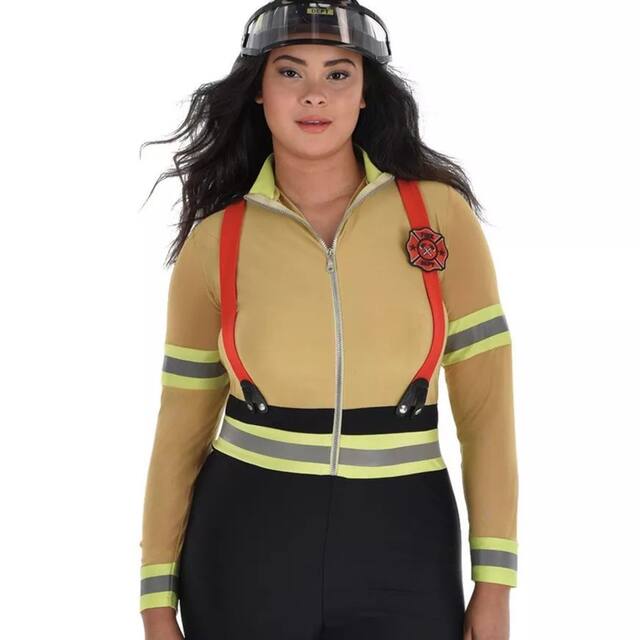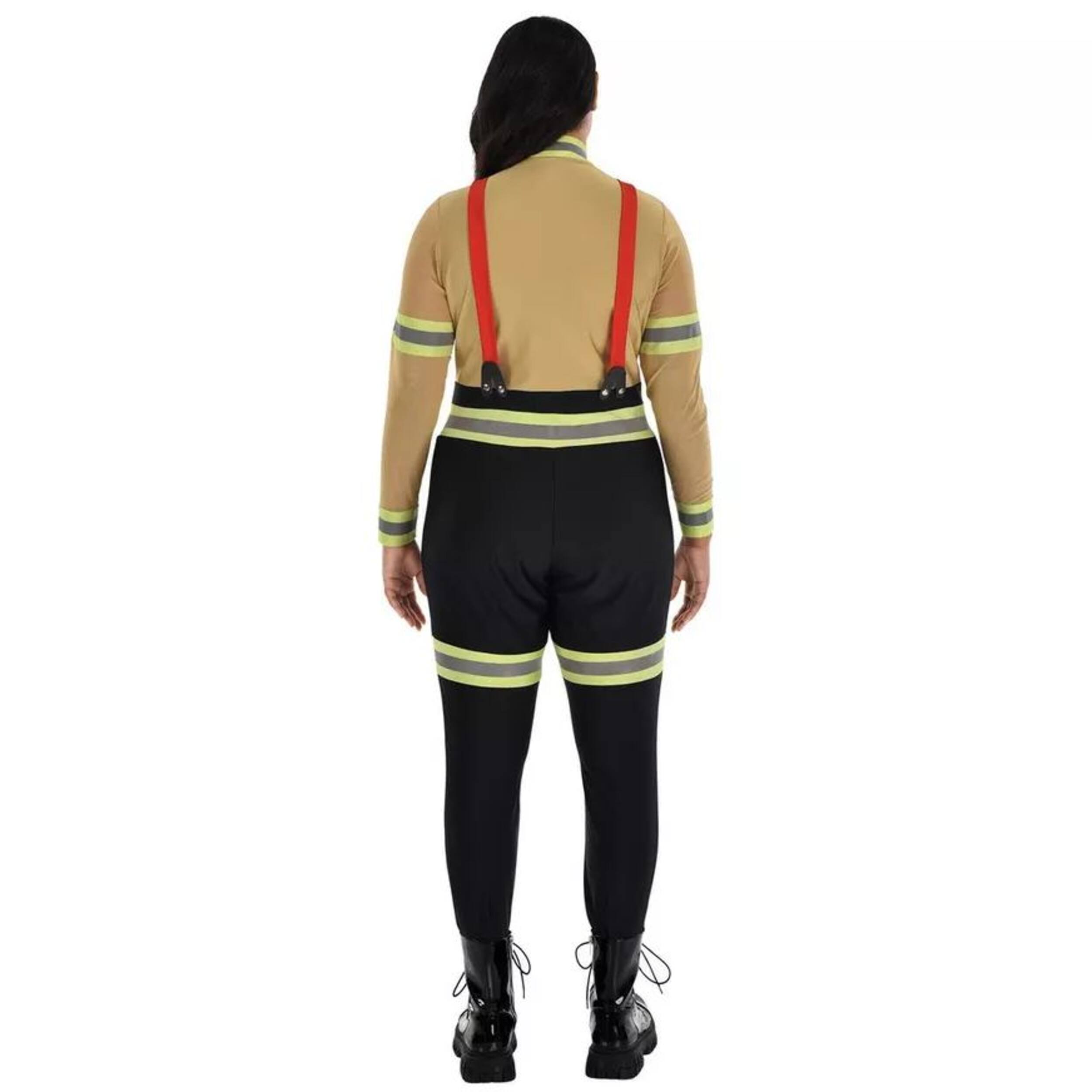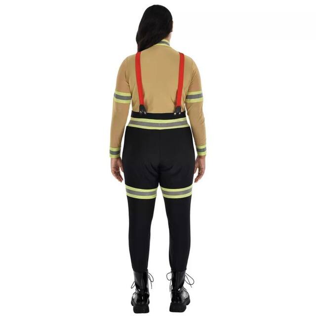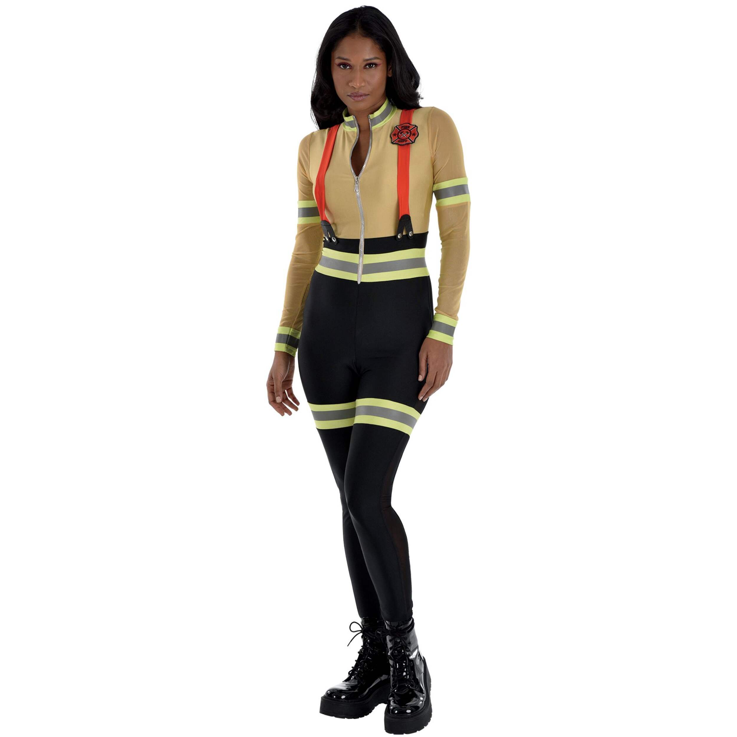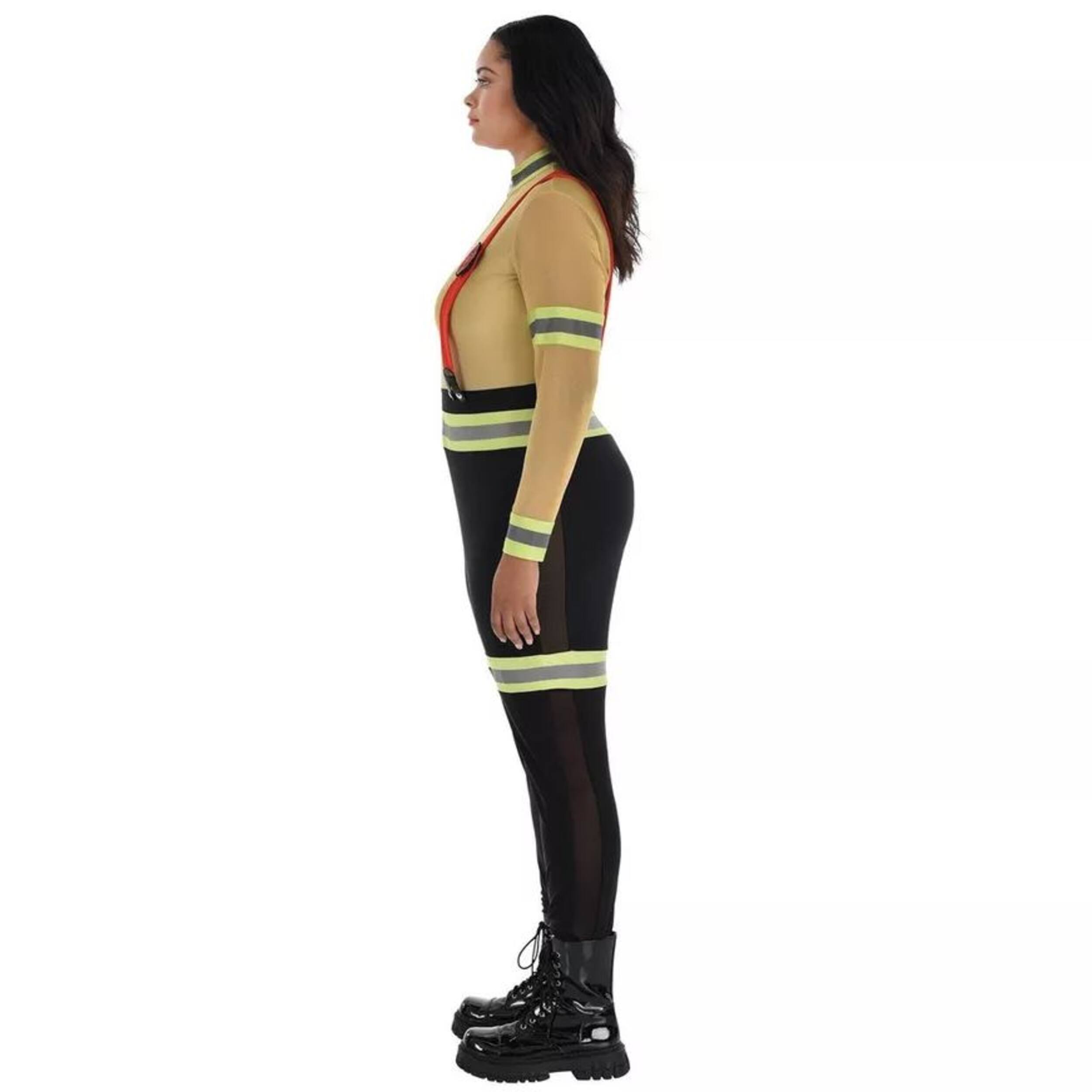 Turn heads this Halloween with the Women's Firefighter Costume. This striking firefighter outfit features a sleek catsuit costume design with attached suspenders and a front zipper for a bold costume look. The reflective costume details and mesh sleeves add an authentic touch, making it perfect for any costume party.