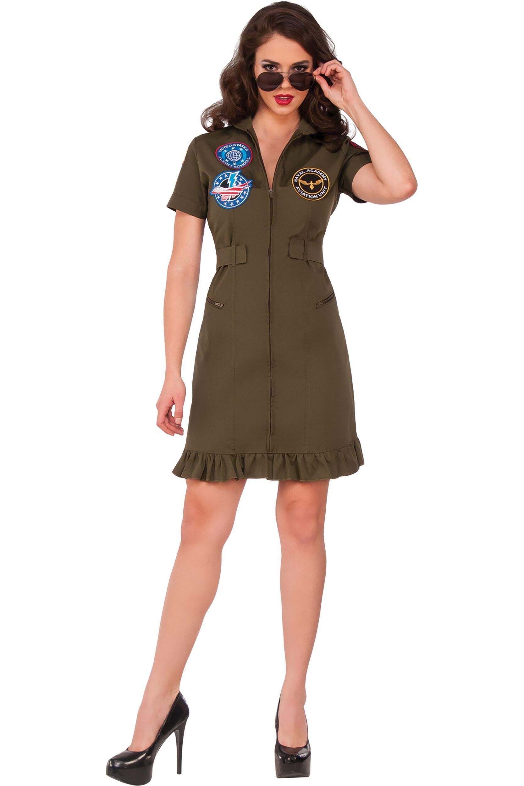 Transform into a high-flying aviator with the Women's Flight School Dress Halloween Costume. This brown dress, adorned with authentic air force badges, is perfect for creating a commanding presence at any Halloween event. The stylish design and attention to detail make it an ideal choice for those looking to impress.