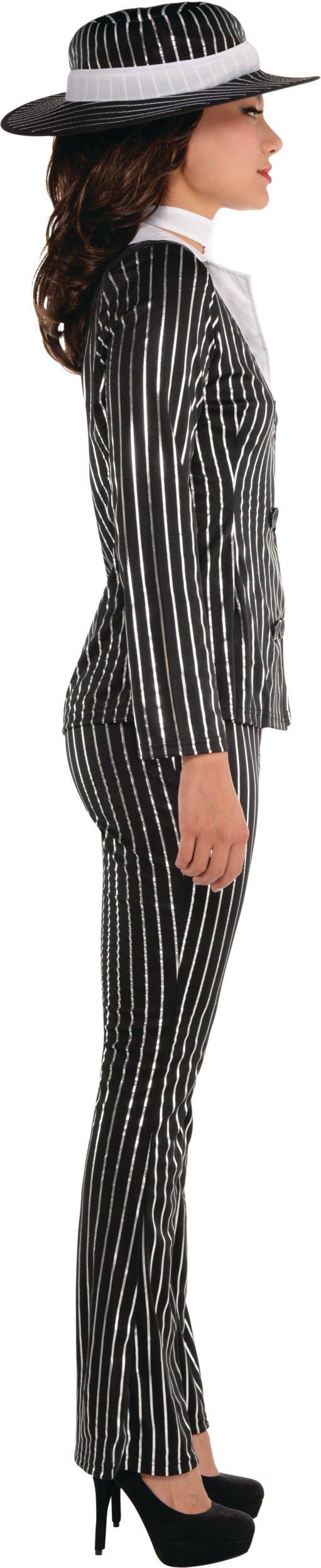 A sleek chunky pinstriped sexy mobster suit with white lapel and matching pinstriped pants will have you looking like a real shot caller
