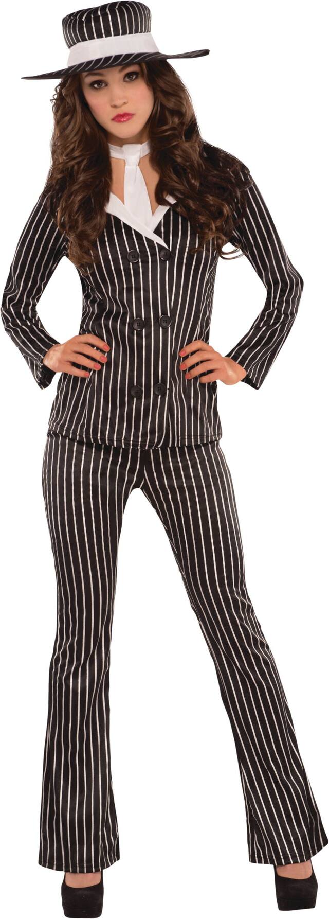This poly-knit Mob Wife Costume includes a matching pinstriped fedora and white necktie