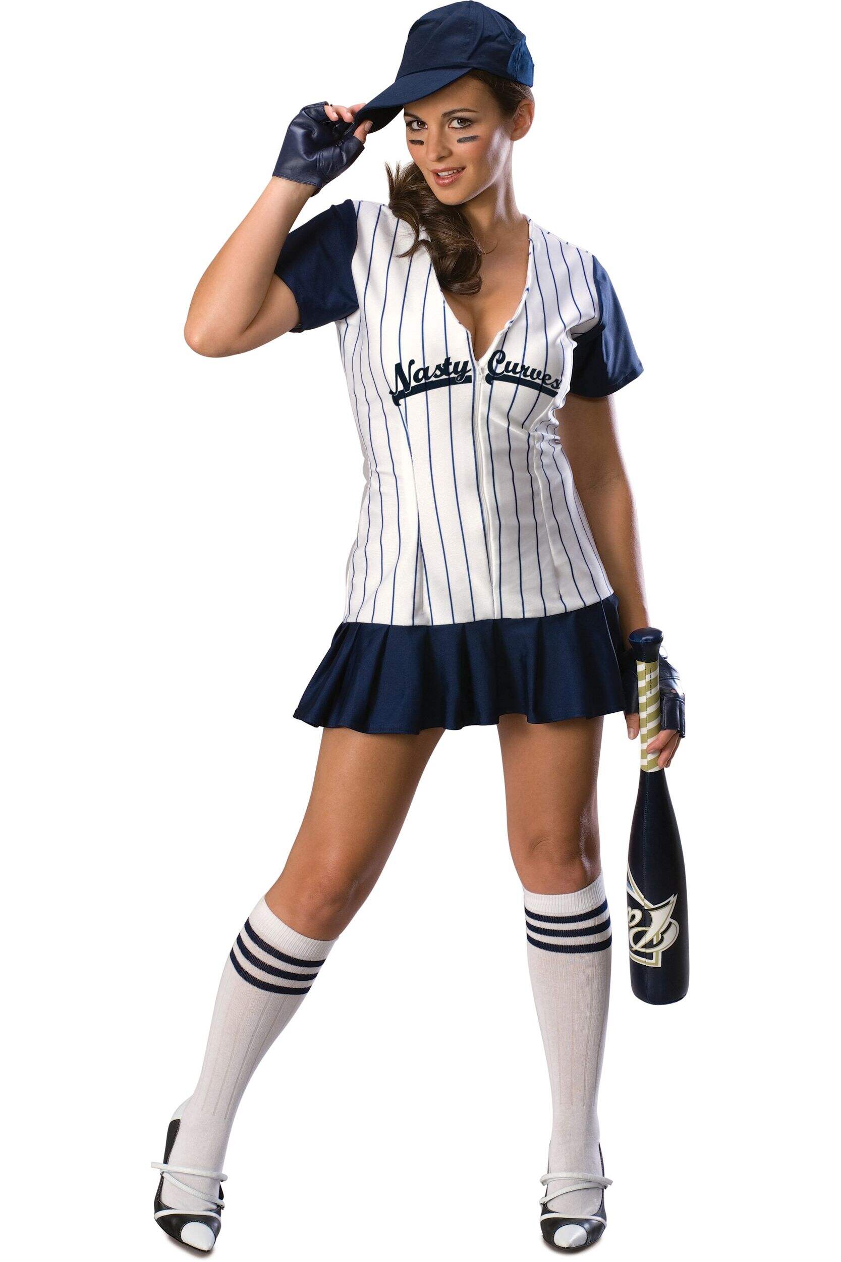 Step up to the plate this Halloween with the Women's NLP-Nasty Baseball Costume. This playful outfit features a white dress with navy blue accents and 'Nasty Curves' emblazoned on the chest, perfect for making a bold statement at any costume party. Complete with matching socks and a hat, you'll be ready to hit a home run in style.