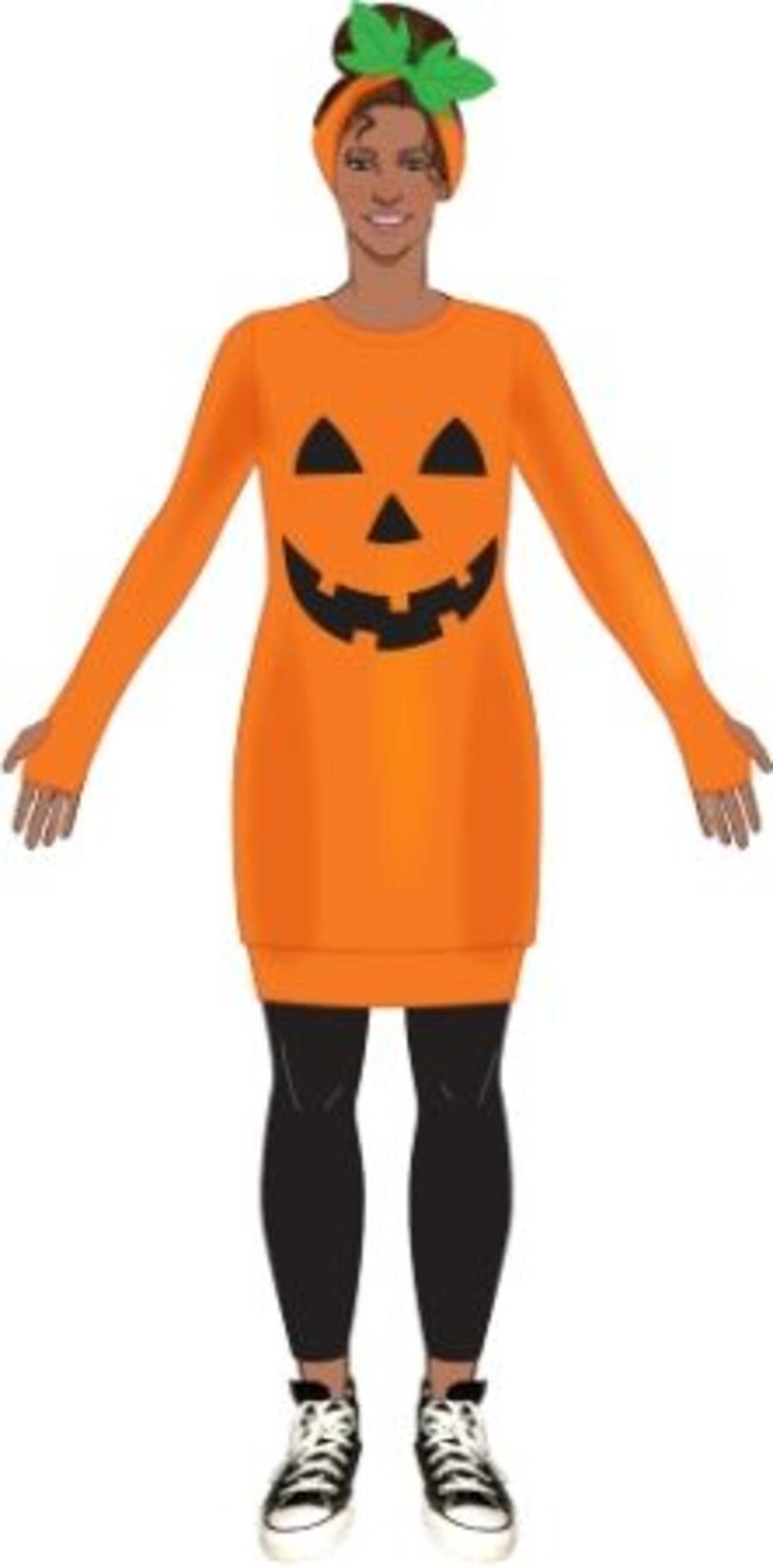 You may be interested in these similar products shown below.Adult Pumpkin Spice Costume features an orange woven tunic with a printed smiling jack-o'-lantern face on the front