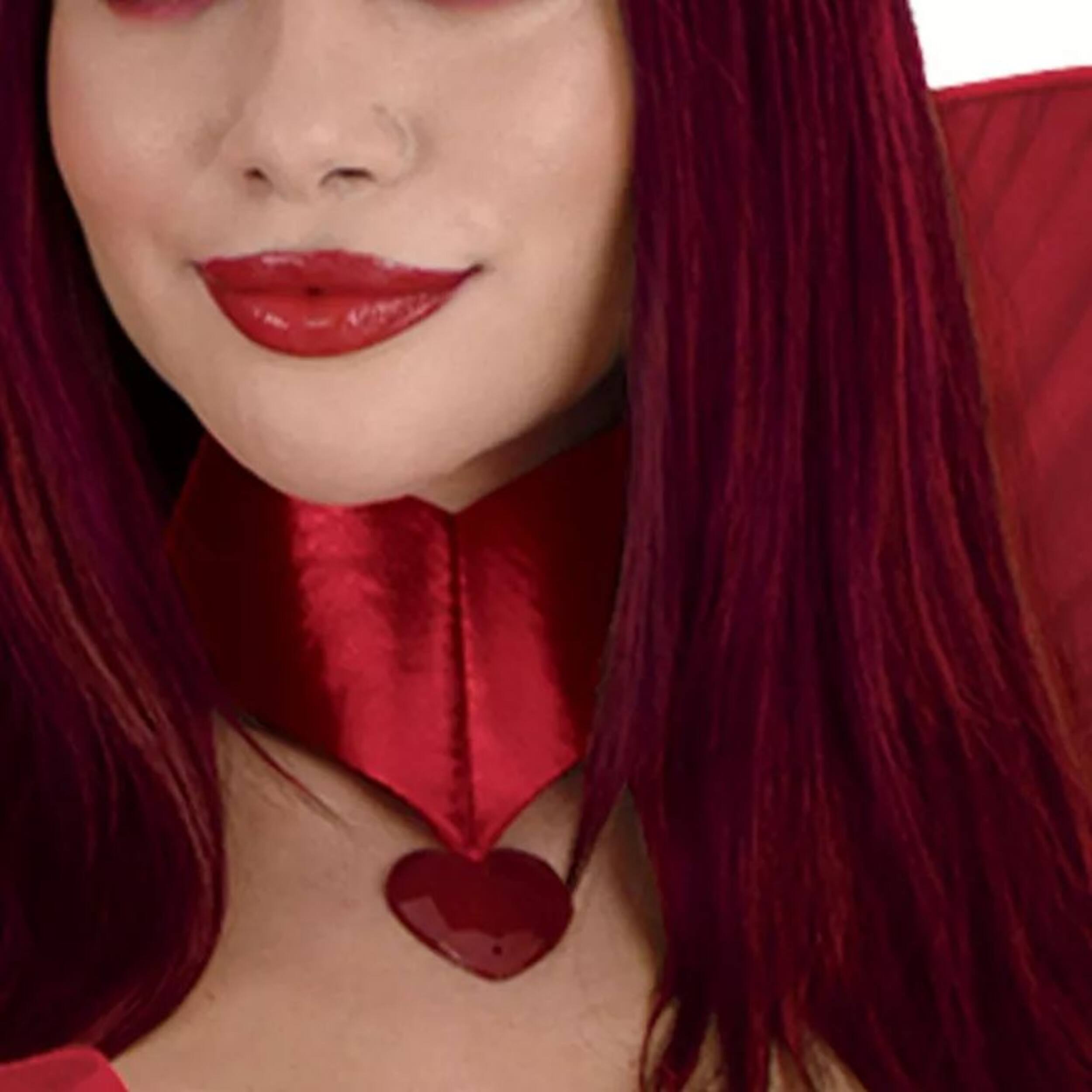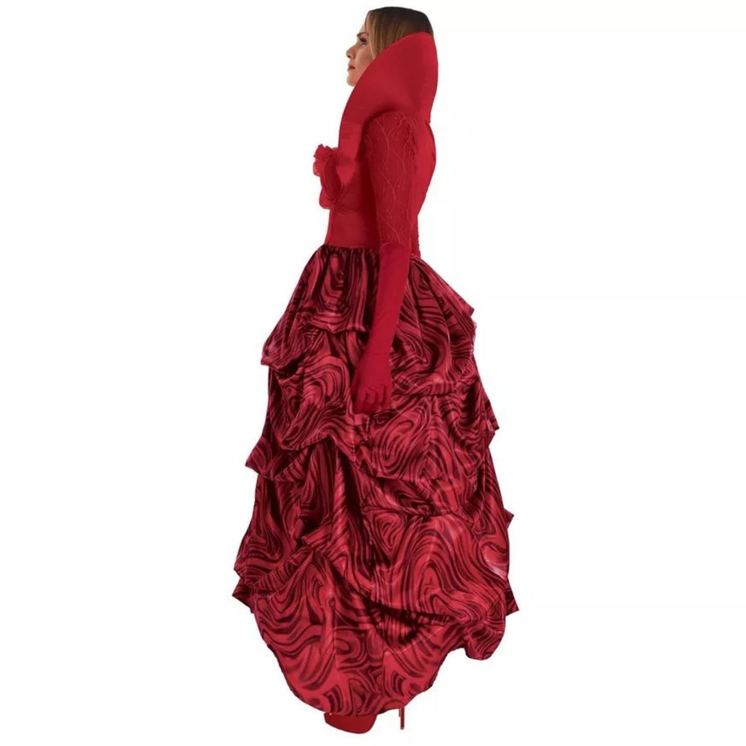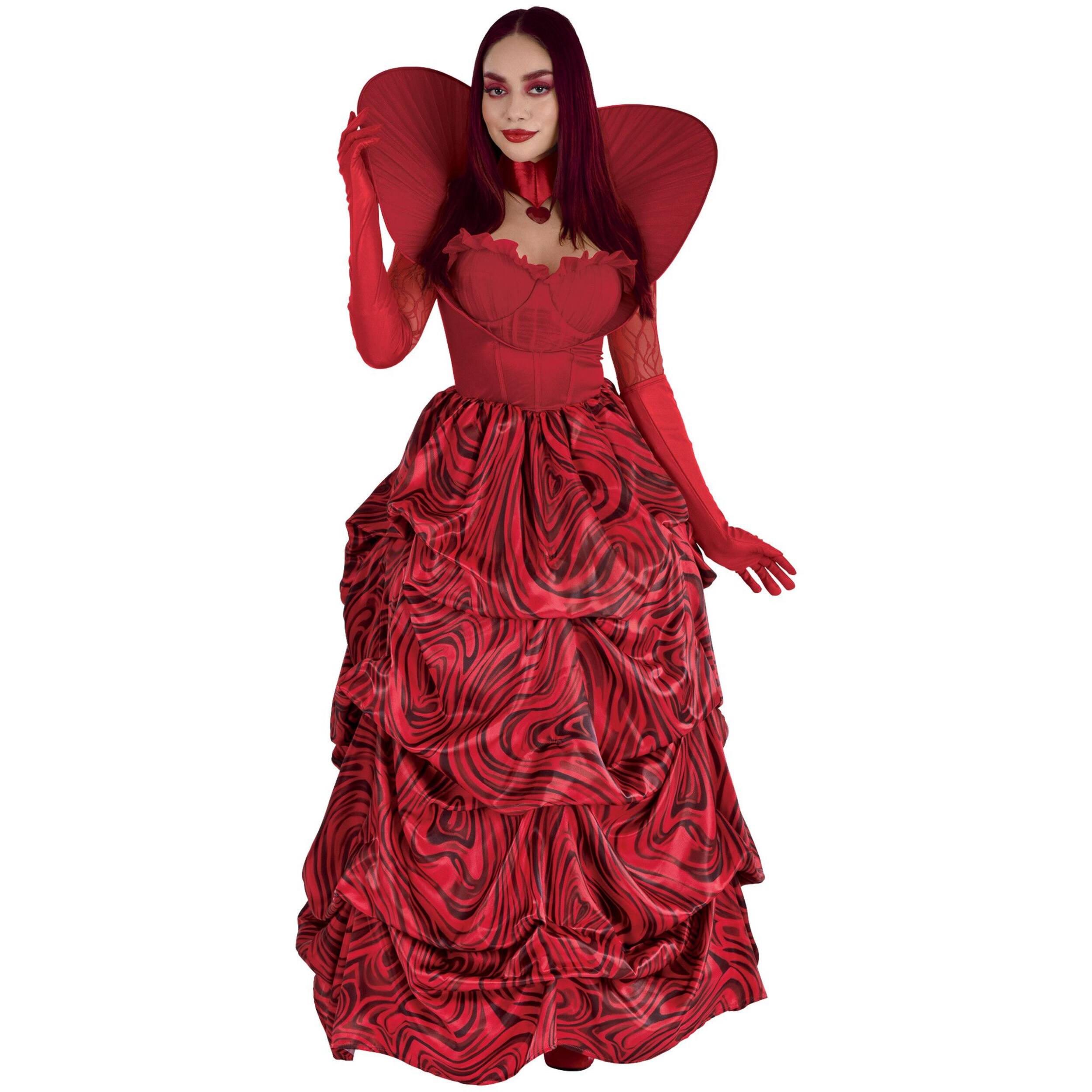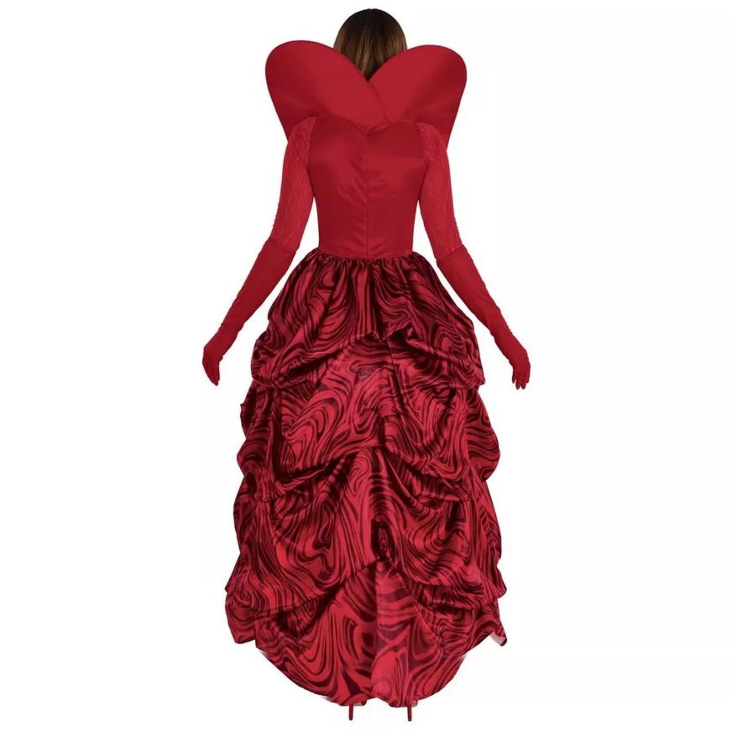 Transform into the regal Queen of Hearts this Halloween with this stunning red dress. Featuring a bubbled marble skirt and a ribbed bodice with elegant trim, this costume dress ensures you stand out at any costume party. Complete your royal look with the included heart necklace and long red gloves from our costume store.