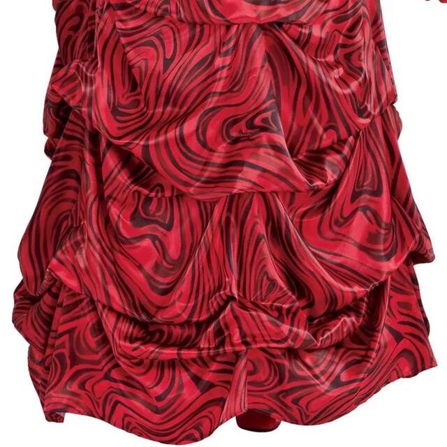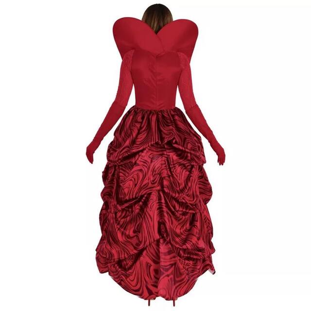 Queen of Hearts costume is a gorgeous red dress with a bubbled marble skirt and a ribbed bodice with trim around the neckline