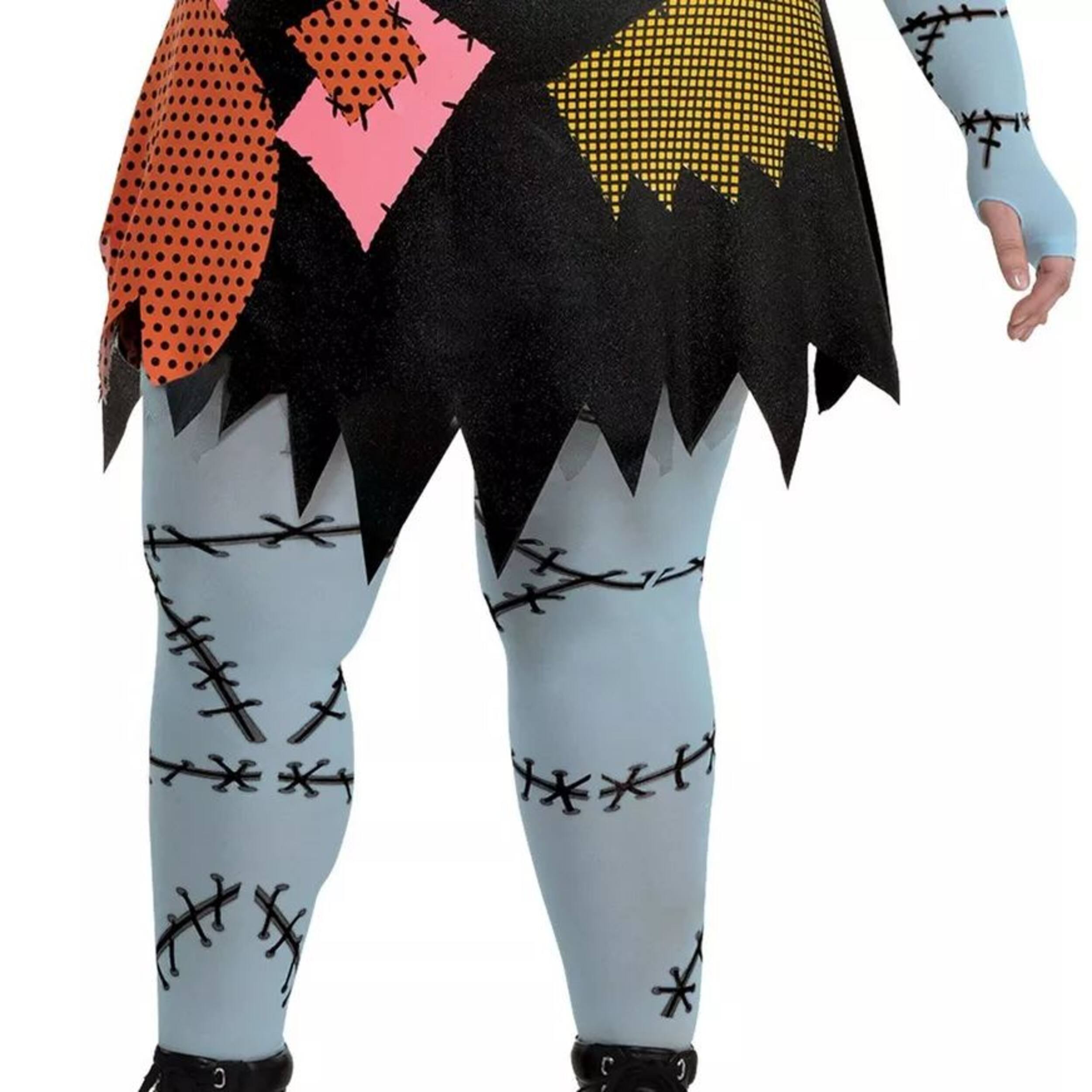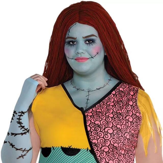 Transform into the beloved character Sally from The Nightmare Before Christmas with this deluxe women's costume. The patchwork dress showcases a unique design and a jagged hem dress, capturing Sally's iconic look. Complete with blue arm warmers, stitched tights, and a red yarn wig, you'll be the sweetest doll in Halloween Town.