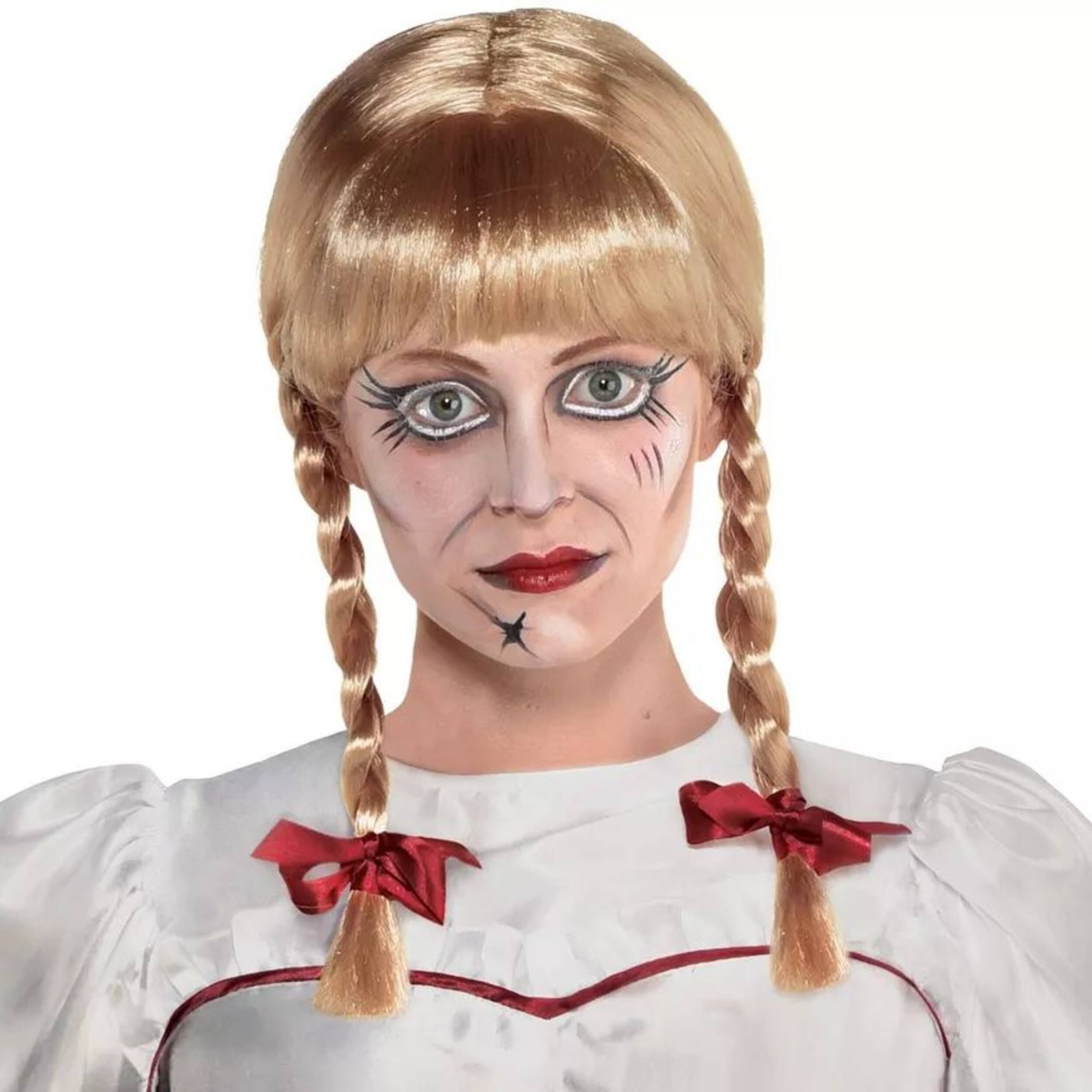 Blonde wig is designed after Annabelle's iconic braided pigtails and blunt-cut bangs