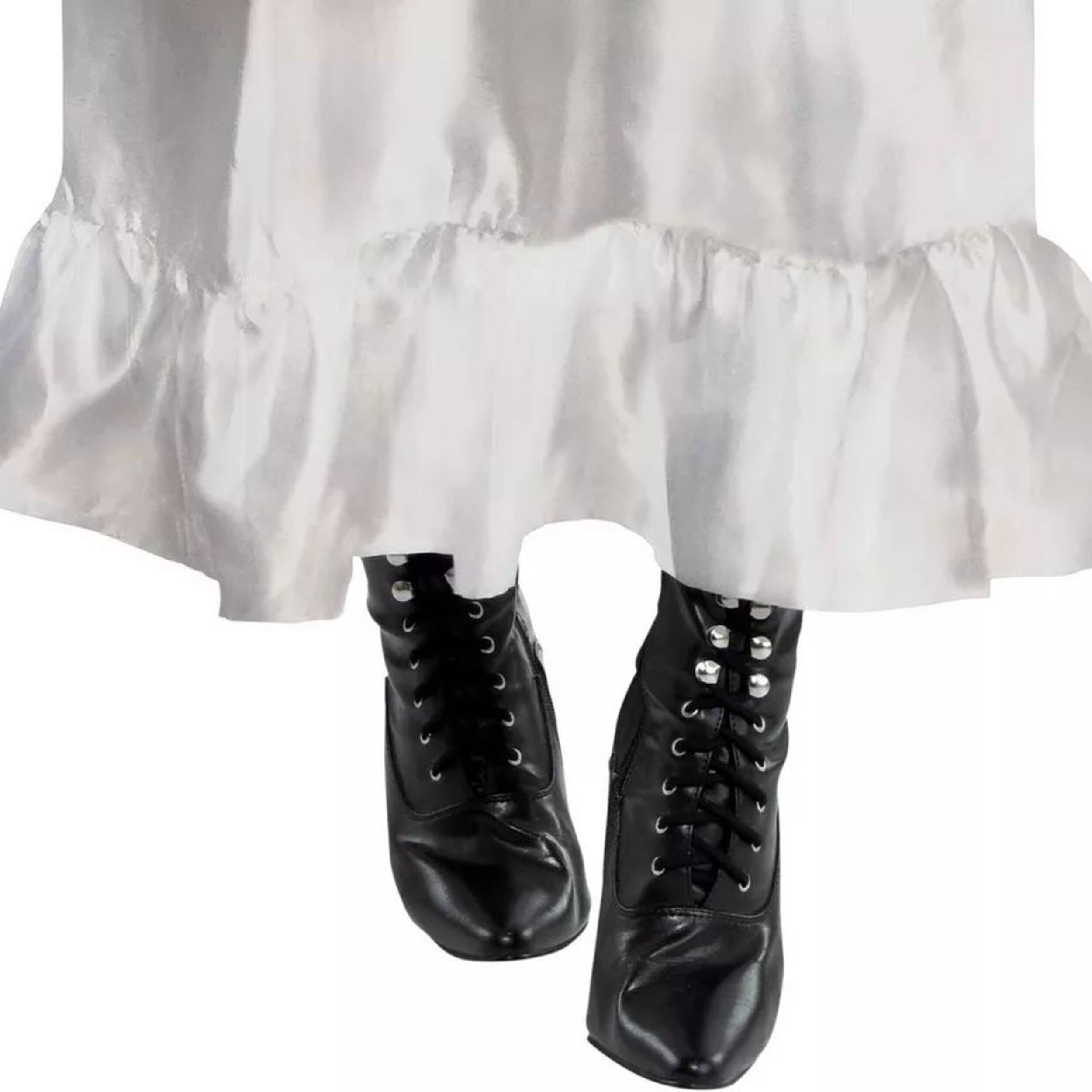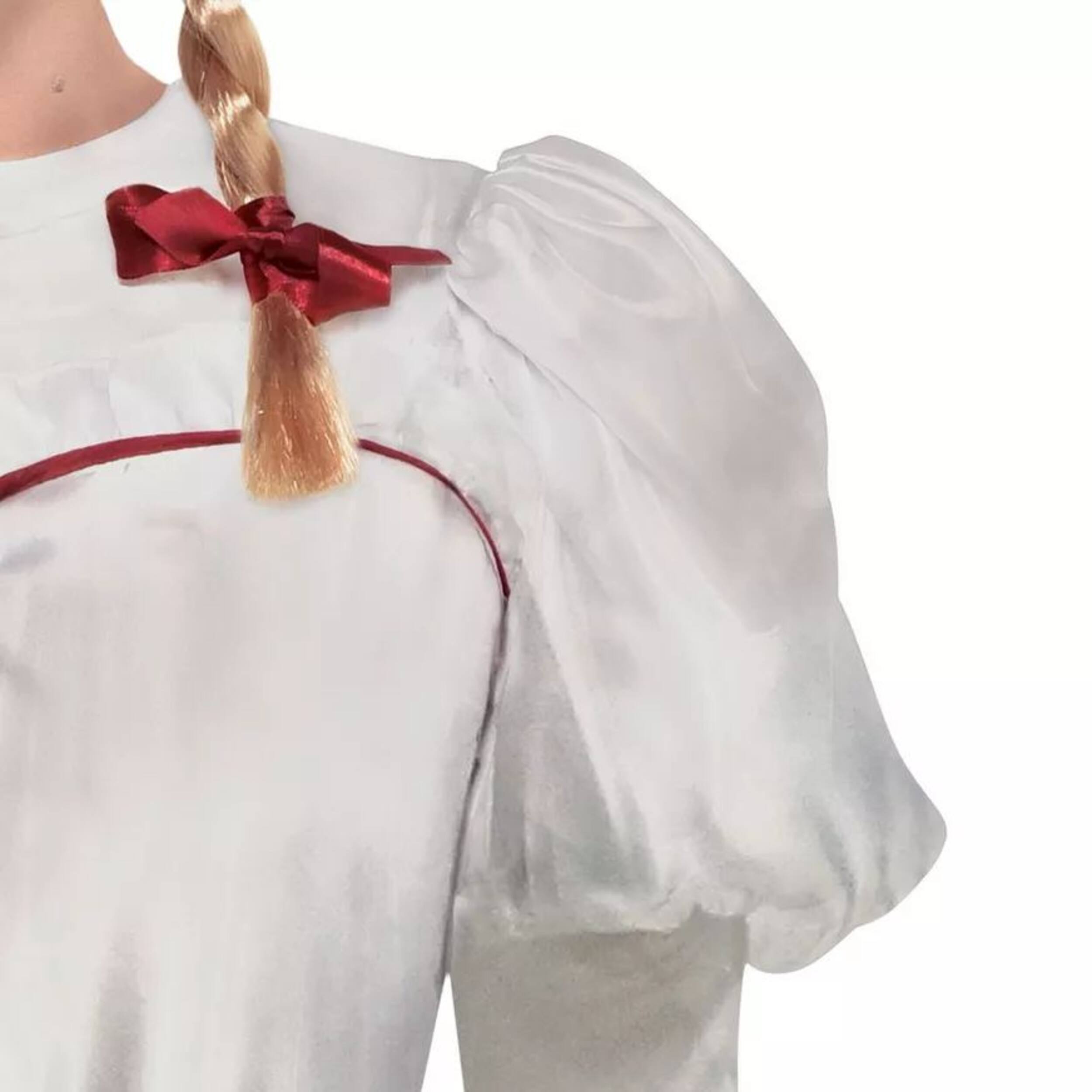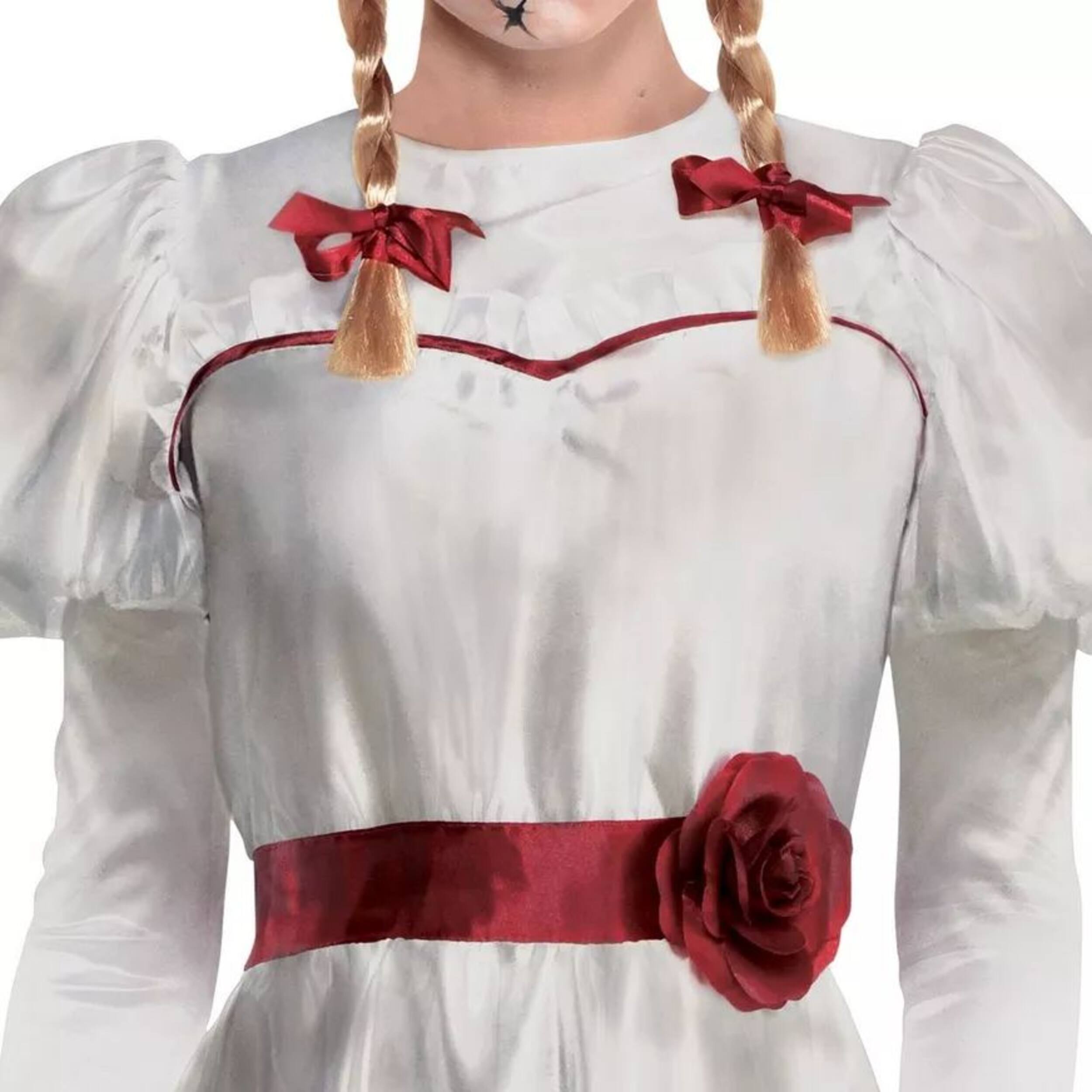 You may be interested in these similar products shown below.Adult Annabelle Comes Home Annabelle Costume is a polyester long-sleeved dress that features puff shoulders, red trim along the sweetheart neckline, and a satin ribbon flower around the waist