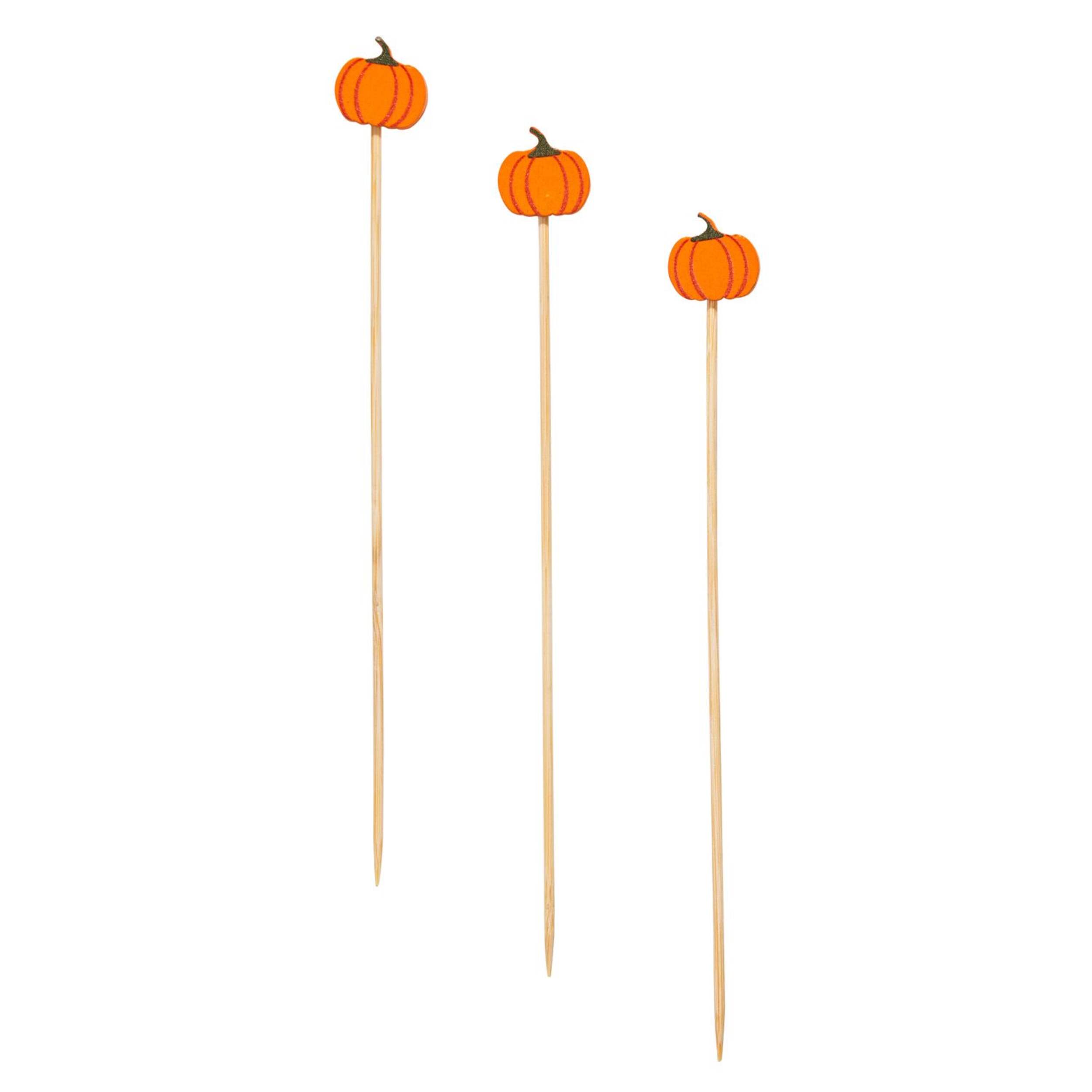 Fall cocktail picks topped with orange pumpkins