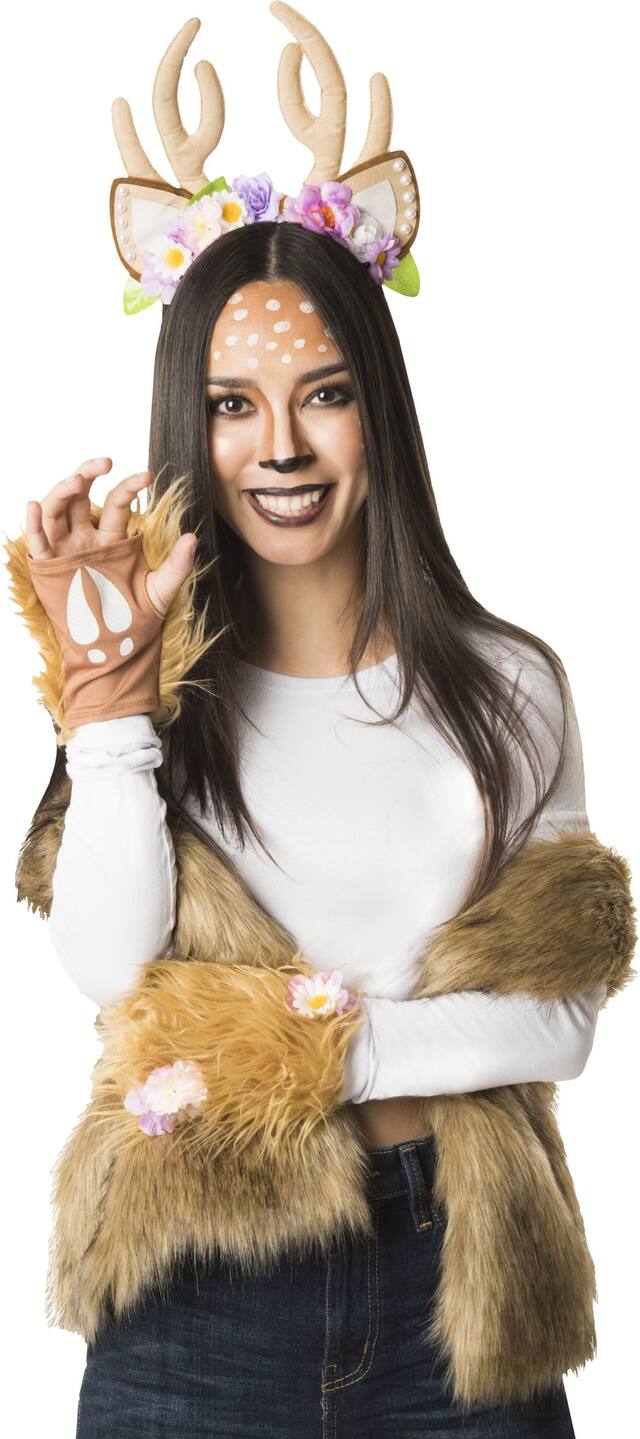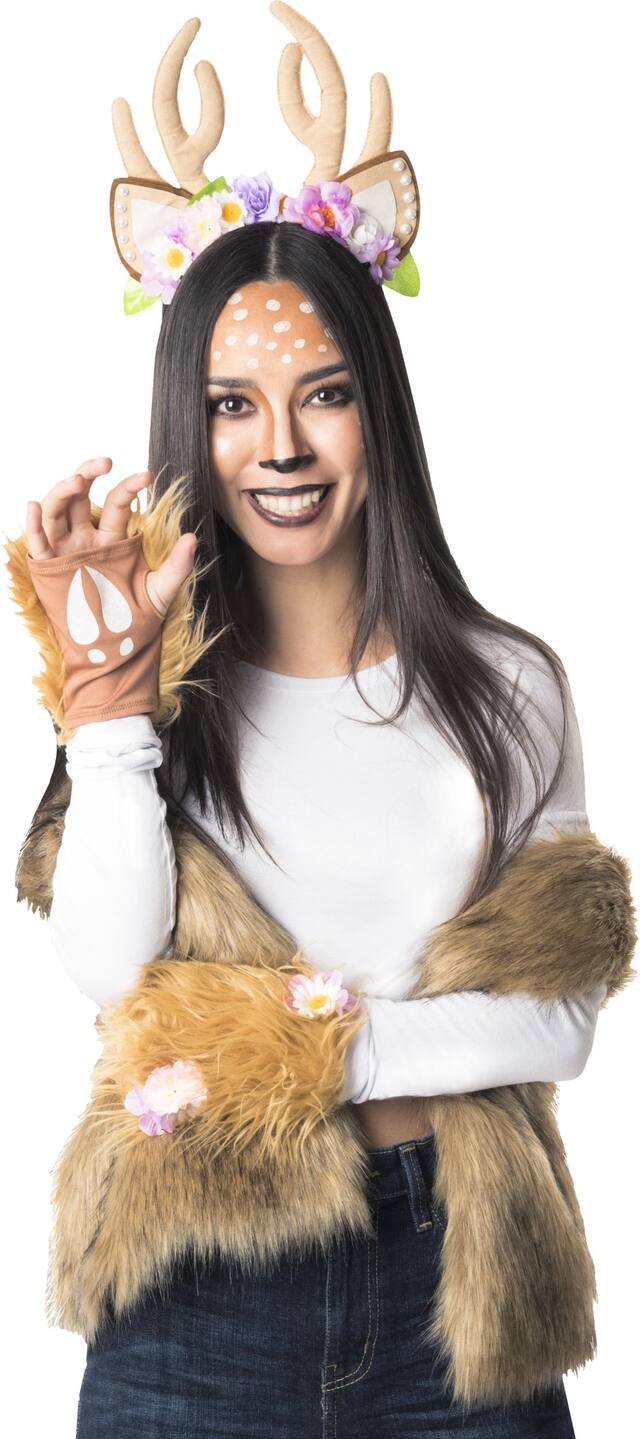 You may be interested in these similar products shown below.Prance around as the prettiest deer at the costume party in the Women's Woodland Deer Costume Accessory Kit, One Size. The accessory kit includes a headband with attached deer antlers, ears, and flowers. The Halloween accessory kit also includes a matching tail and gloves with brown faux fur and attached flowers. You'll look a-doe-rable when you dress up with this Woodland Deer Costume Accessory Kit! The costume kit is perfect for Halloween-themed parties.