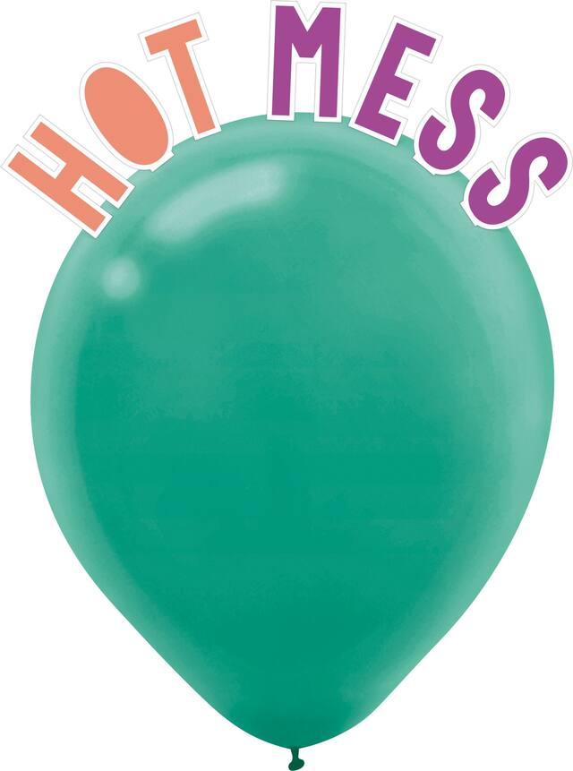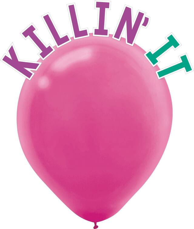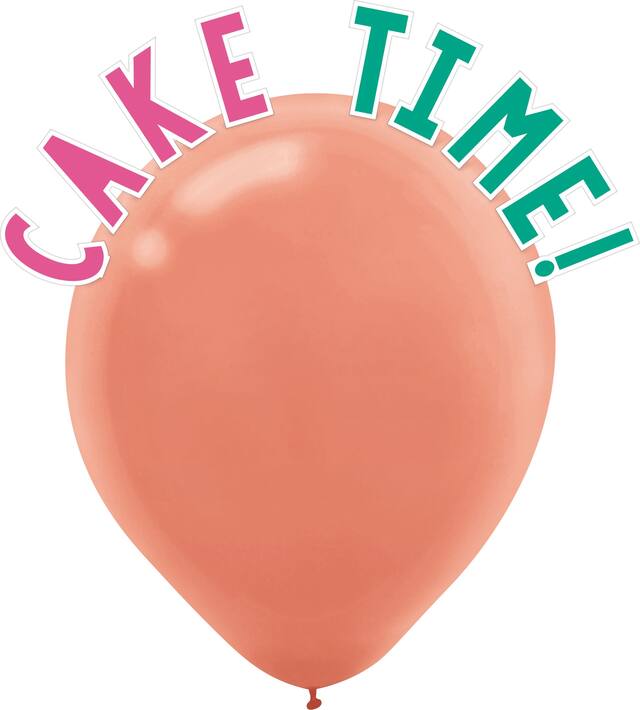 Balloons come with paper attachment messages including "B-Day Vibes", "Hot Mess", "B-Day On Fleek", "Killin' It", "I'm So Fancy", and "Cake Time!" in colourful block letters