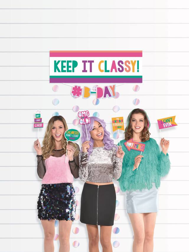 Kit includes a backdrop that reads "Keep It Classy!" with a "#B-Day" cut-out attached to it