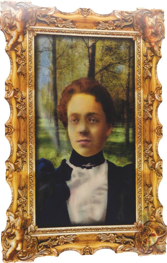 Full colour lenticular portrait is made of lightweight thin vinyl and includes a printed scrollwork frame with angels dissolving into devils