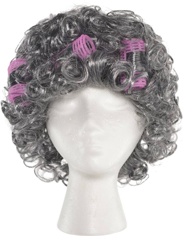 Trousse d'accessoires comprenant une perruque grise en fibre synthétique avec des bigoudis roses attachées, des lunettes blanches avec une monture en forme d'œil de chat et un collier en fausses perles