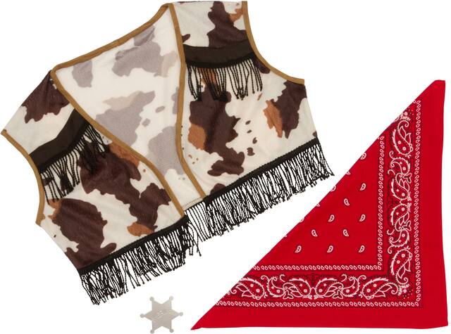 Accessoires Western pour enfants comprenant un bandana rouge, une veste en similicuir et un badge de shérif