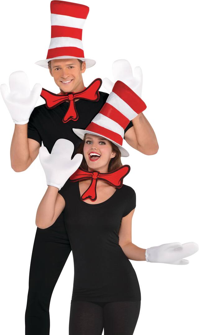 Comprend un haut-de-forme rayé rouge et blanc à bord en fil métallique, un noeud papillon en feutre rouge et des gants blancs qui ressemblent à la tenue emblématique du Chat dans le Chapeau