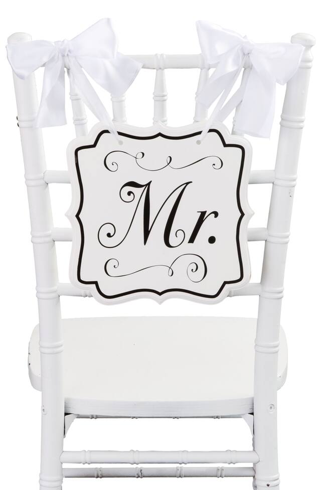 Ces produits similaires présentés ci-dessous pourraient vous intéresser.Affiche de chaise blanche pour mariage Mr affichant les lettres « Mr » en noir avec des motifs de spirales