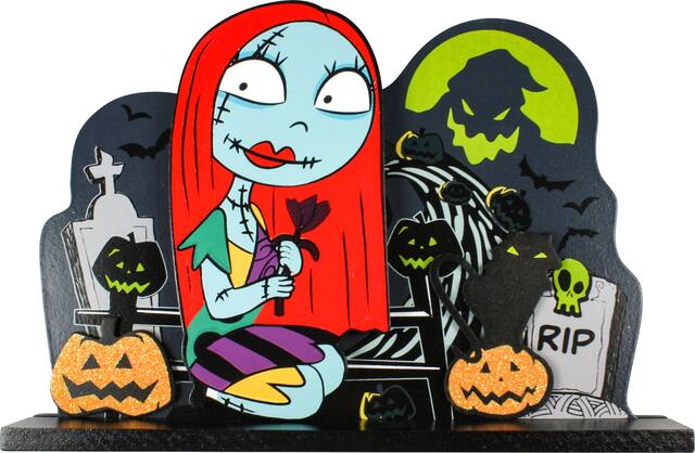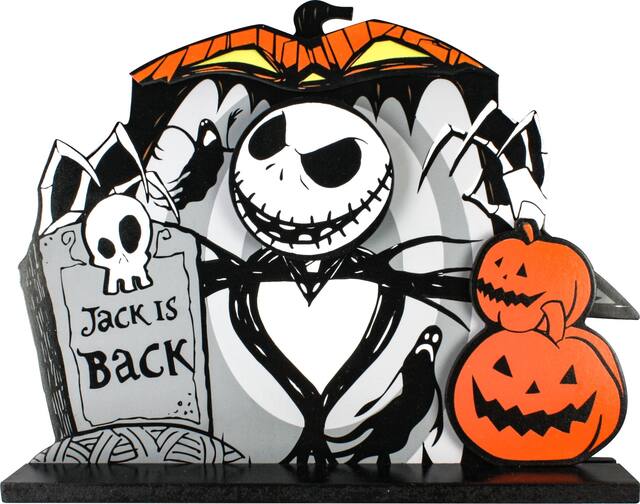 Décoration de dessus table en panneau de fibres comportant 2 modèles de Jack et de Sally entourés de citrouilles lanternes, de crânes et de pierres tombales