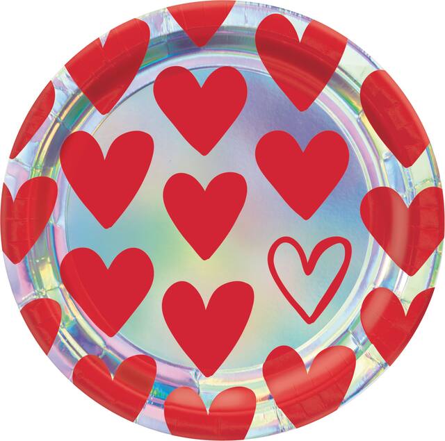 Petites assiettes en papier dotées d'un grand cœur rouge au centre et de petits cœurs roses et rouges sur la bordure