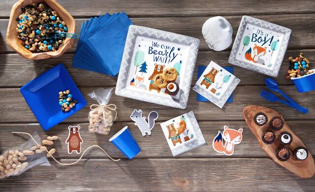 Ces produits similaires présentés ci-dessous pourraient vous intéresser.Assiettes à dîner Can Bearly Wait décorées d'animaux de la forêt sur le thème de la forêt et comportant une bannière contenant « It's a Boy »