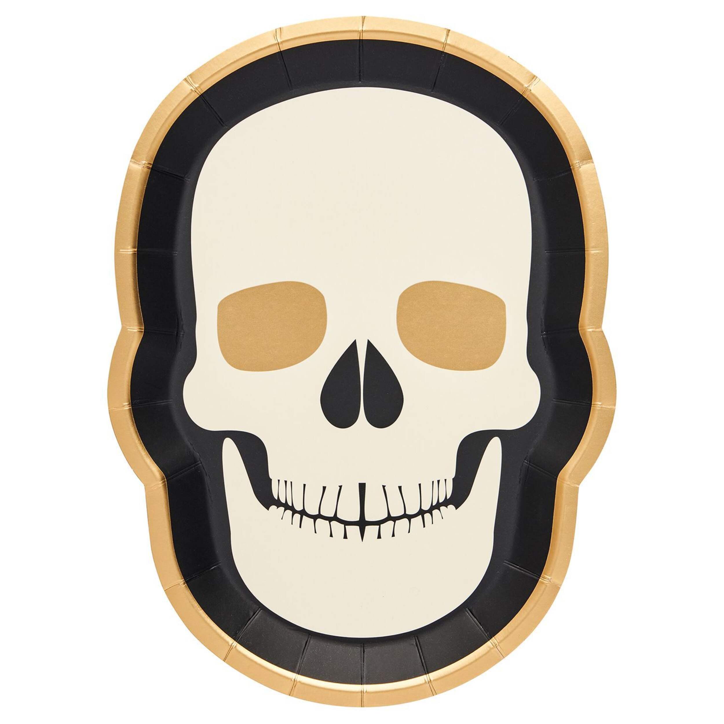 Assiettes blanches avec bordure noire et dorée représentant un crâne aux yeux dorés et aux traits noirs
