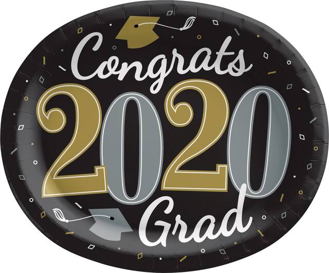 Ces produits similaires présentés ci-dessous pourraient vous intéresser.Assiettes en papier ovales Congrats 2020 Grad comportant le titre « Congrats 2020 Grad » en doré, en argenté et en blanc sur fond noir