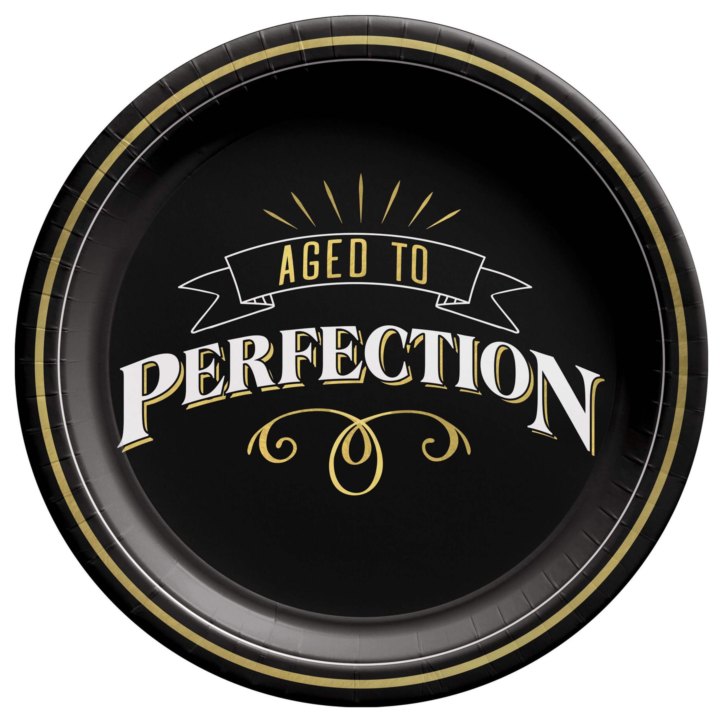 Chaque assiette noire est dotée d’une bordure dorée et du message Aged to Perfection mis en valeur par des volutes dorées