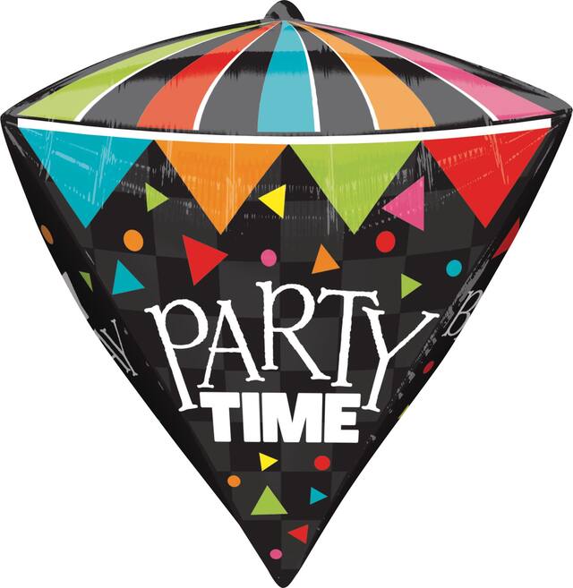 Ces produits similaires présentés ci-dessous pourraient vous intéresser.Ballon de fête d'anniversaire Diamondz est en forme de cône avec des motifs géométriques brillants et affiche « Party Time » et « Happy Birthday »