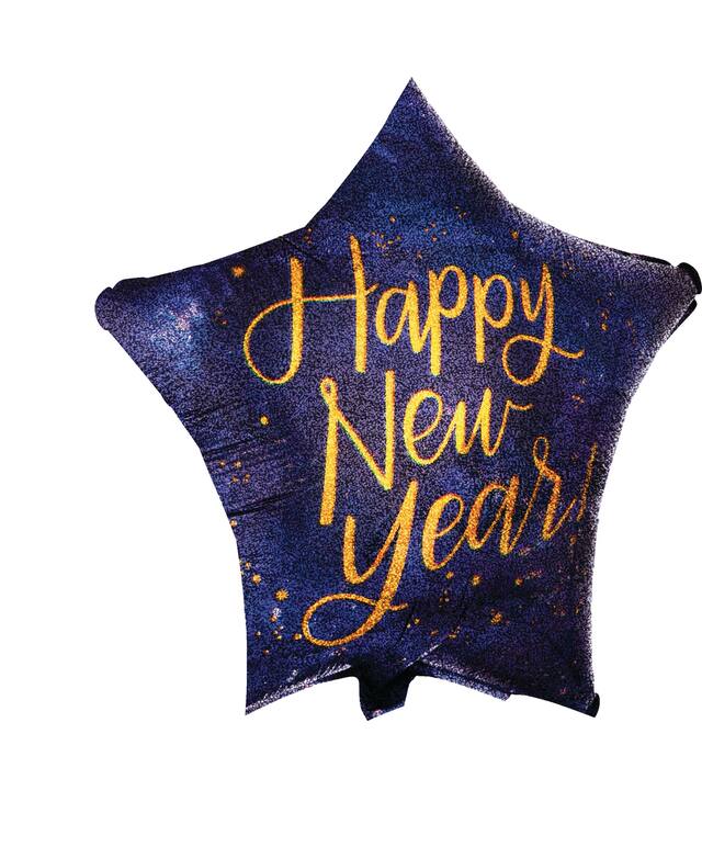 Ce ballon bleu en forme d'étoile affiche le message « Happy New Year! » en doré et des étoiles dorées