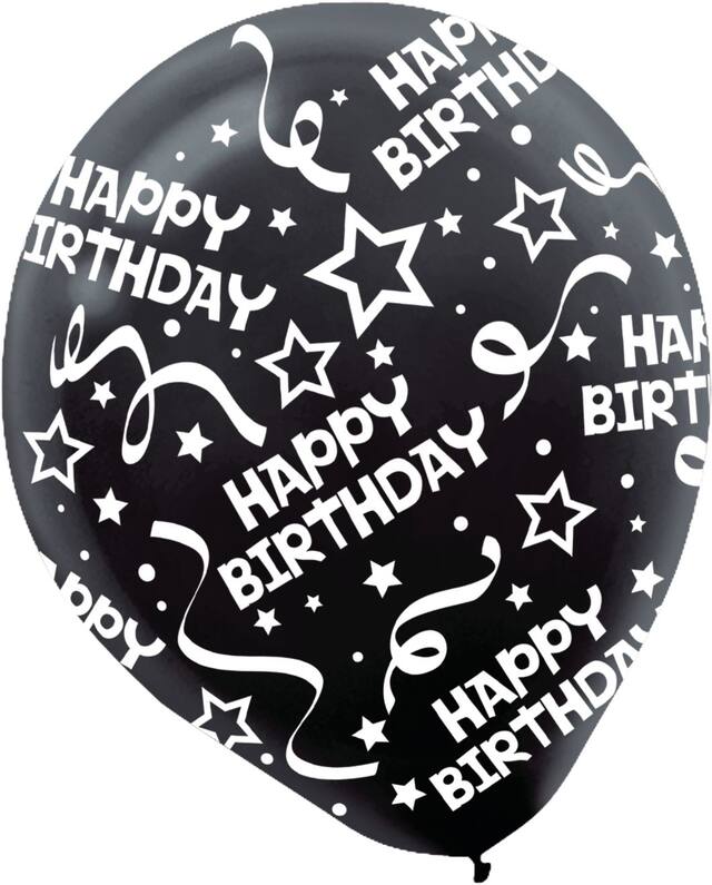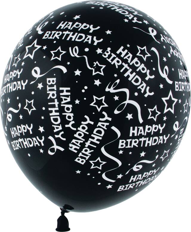 Ballons festifs qui ont des confettis blancs imprimés et l’inscription « Happy Birthday »