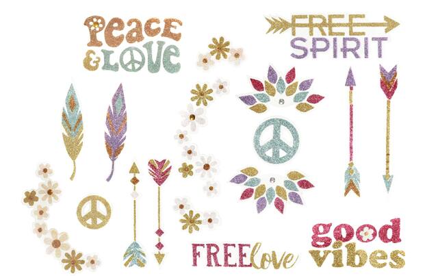 Autocollants scintillants pour le corps présentant des motifs de fleurs, de signe de paix, de plumes et d'autres motifs hippies, et constituant la touche finale parfaite pour votre style d'enfant des fleurs