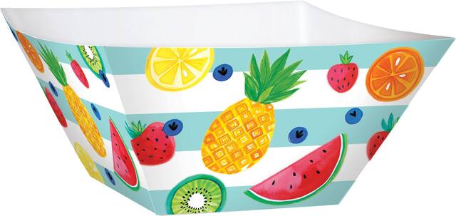 Grands bols carrés en papier cartonné dotés de motifs colorés de fruits sur un fond à rayures bleu clair et blanc, un complément parfait pour le reste de vos articles de table sur le thème de l'été