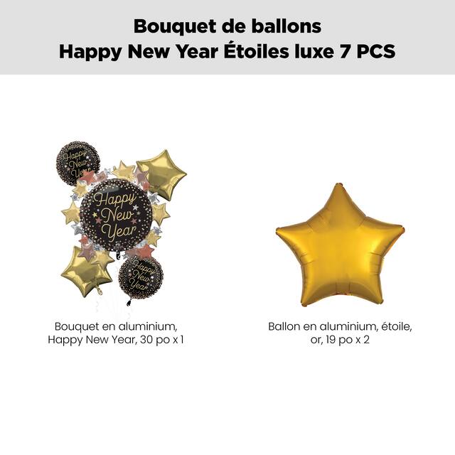 Contenu de l'ensemble : 1 ballon de forme extraordinaire en forme Happy New Year de luxe avec étoiles (UCS 855-4569), comprenant un ballon de 30 po, 2 ballons ronds de 18 po assortis, 2 ballons dorés en forme d'étoile de 18 po et 2 ballons en aluminium dorés en forme d'étoile de 18 po (UCS 842-3946)
