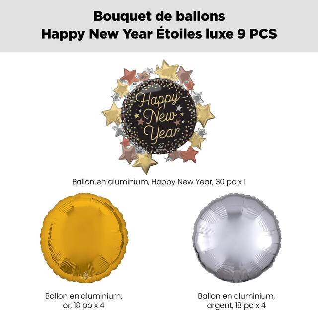 Contenu de l'ensemble : 1 ballon de forme extraordinaire Happy New Year de luxe avec étoiles de 30 po (UCS 855-4573), 4 ballons ronds en aluminium dorés 18 po (UCS 842-3908) et 4 ballons ronds en aluminium argentés 18 po (UCS 842-3906)
