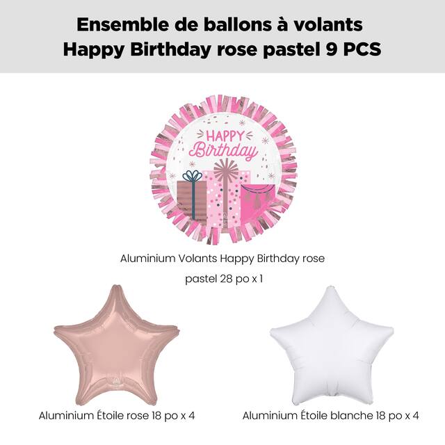 • Contenu de l'ensemble : 1 ballon géant Happy Birthday à franges rose pastel de 28 po (UCS 8551388), 4 ballons en aluminium étoiles rose pastel de 18 po (UCS 8423880) et 4 ballons en aluminium étoiles blancs de 18 po (UCS 8423948)