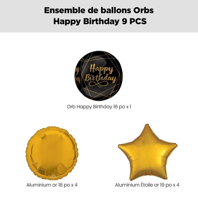 Contenu de l'ensemble : 1 ballon Orbz Happy Birthday de 16 po (UCS 8547855), 4 ballons en aluminium ronds dorés de 18 po (UCS 8423908) et 4 ballons en aluminium étoiles dorés de 18 po (UCS 8423946)