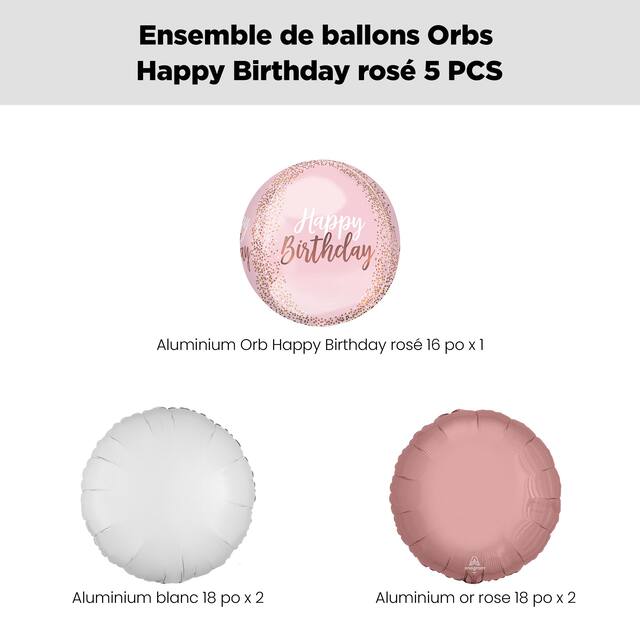 • Contenu de l'ensemble : 1 ballon Orbz Happy Birthday rose tendre de 16 po (UCS 8548024), 2 ballons en aluminium ronds blancs de 18 po (UCS 8423910) et 2 ballons en aluminium ronds rose doré de 18 po (UCS 8424072)