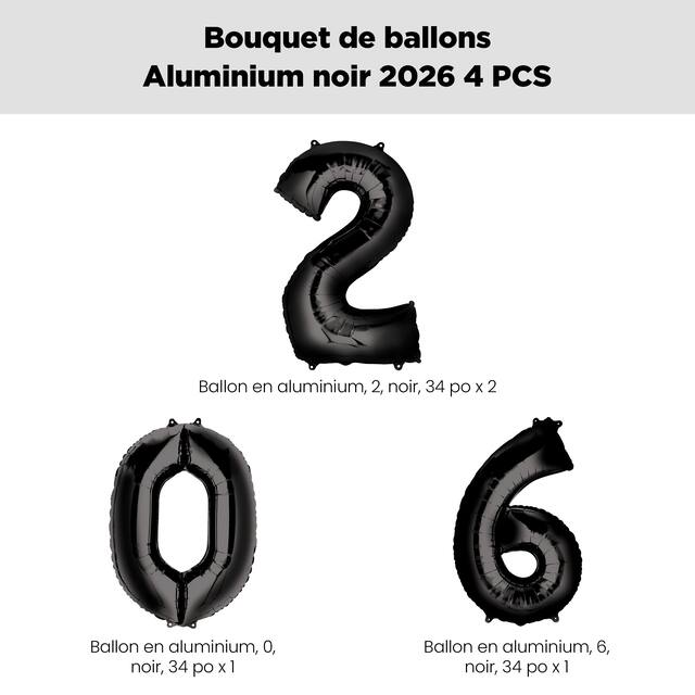 Contenu de l'ensemble : 2 ballons chiffre 2 noir en aluminium de 34 po (UCS 842-4286), 1 ballon chiffre 0 noir en aluminium de 34 po (UCS 842-1051) et 1 ballon chiffre 6 noir en aluminium de 34 po (UCS 842-4287)