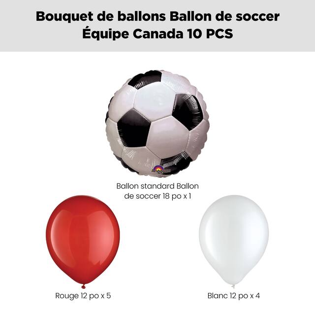 Comprend un ballon en forme de ballon de soccer avec des ballons rouges et blancs assortis, rendant un clin d’œil à l’Équipe Canada