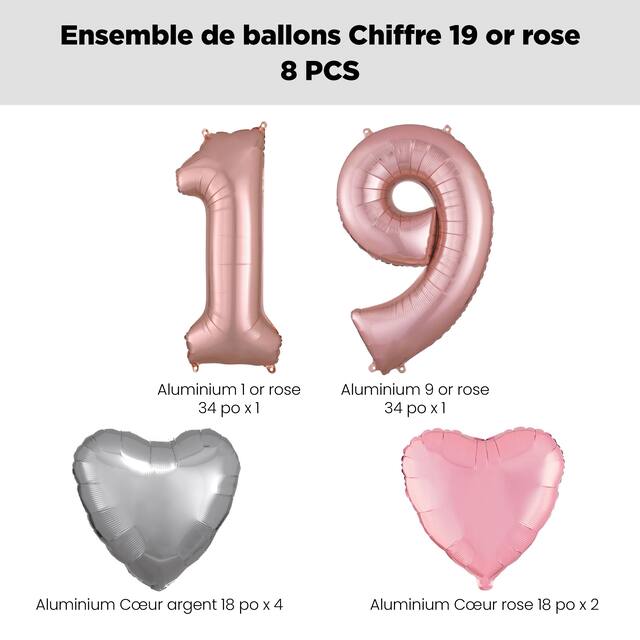 Comprend ce qui suit : 1 ballon chiffre 1 or rose de 34 po (UCS 8424076), 1 ballon chiffre 9 or rose de 34 po (UCS 8424084), 4 ballons en aluminium coeur argenté de 18 po (UCS 8423884) et 2 ballons en aluminium coeur rose de 18 po (UCS 8424235)