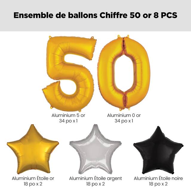 Comprend ce qui suit : 1 ballon chiffre 5 doré de 34 po (UCS 8424252), 1 ballon chiffre 0 doré de 34 po (UCS 8424247), 2 ballons en aluminium étoile dorée de 18 po (UCS 8423946), 2 ballons en aluminium étoile argentée de 18 po (UCS 8423944), 2 ballons en aluminium étoile noire (UCS 8423875)